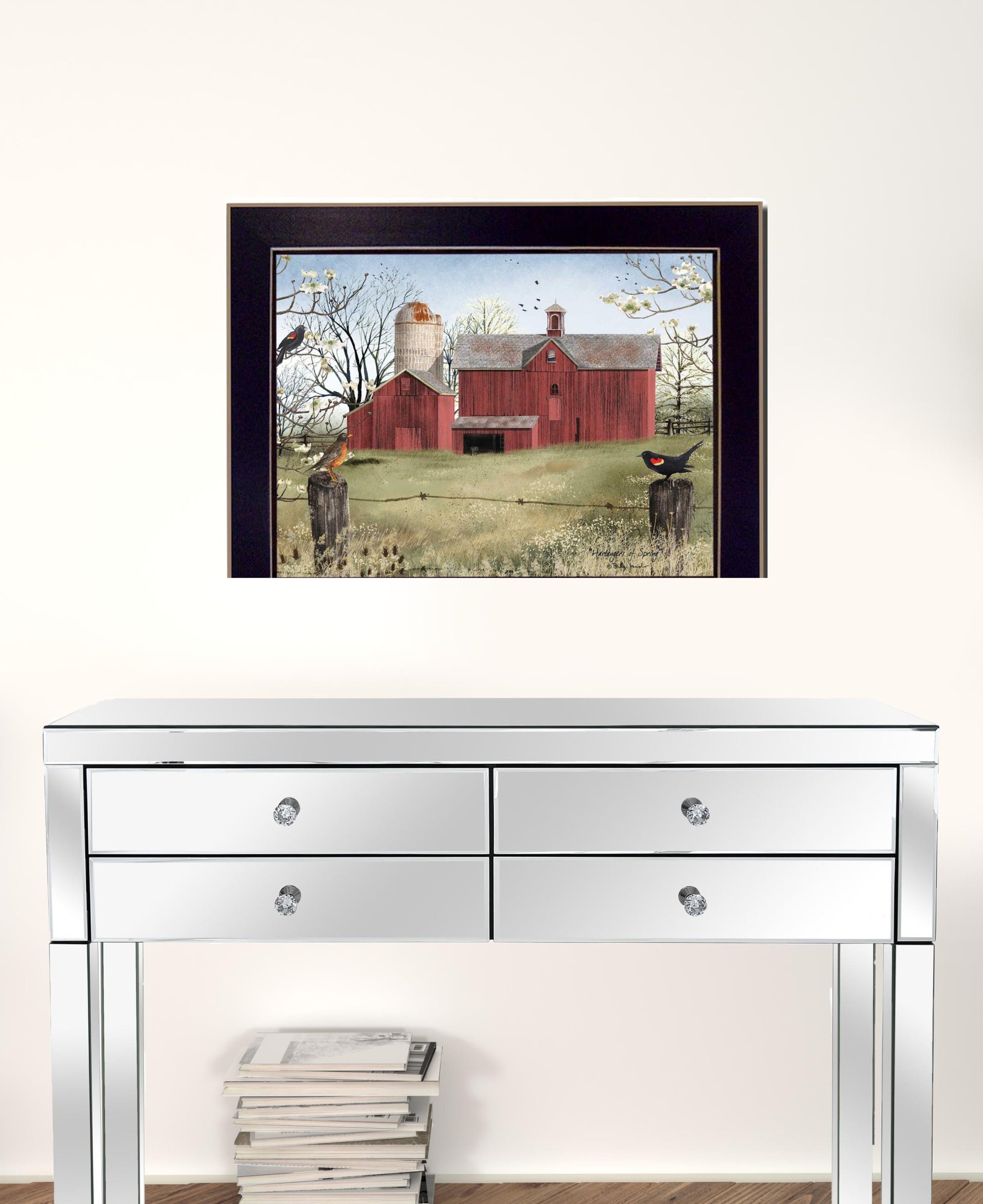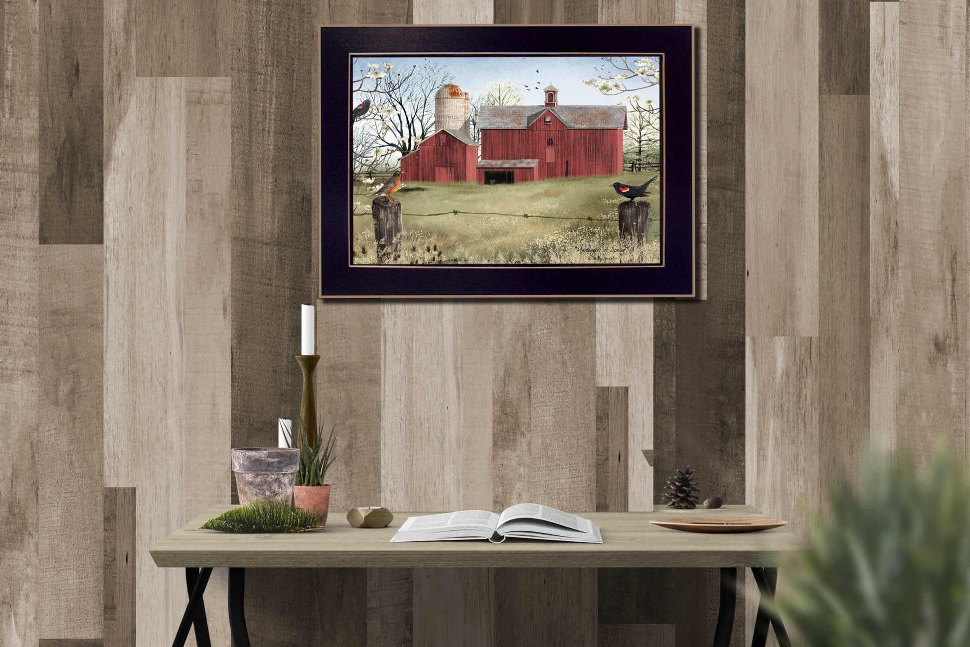 Add an air of fashion to your room and rejuvenate the space with this rustic red barn and birds black framed print wall art. This print is a visual artistic expression that allows you to decorate your space in style. Reproduced for you on paper, this hanging decorative accent will be a trendy and fashionable way to dress your walls. Hang on your wall to add some up to date fashion and decoration. Utilize this opportunity to create a focal point in the room with this fabulous wall decor option. 22 inches H x 28 inches W x 1 inches D
