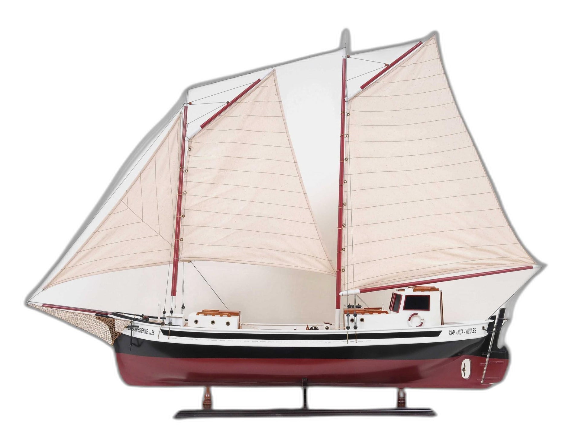 This model hull is handcrafted from strips of wood using plank on frame construction method. It is then painted in three colors. The deck is beautifully planked from many strips of wood. There are various details on the deck such as hatches, winches, and cabin. Located on the deck is a metal tilter near the companionway. The stitched sail and intricate rigging complete the definition of a true sailing boat. The model is secured tightly on a solid wood base with a brass nameplate. The mast and sail are folded down for easy packaging and shipping. Itll make a perfect gift for home or office decorator, boat enthusiast, or passionate collector.