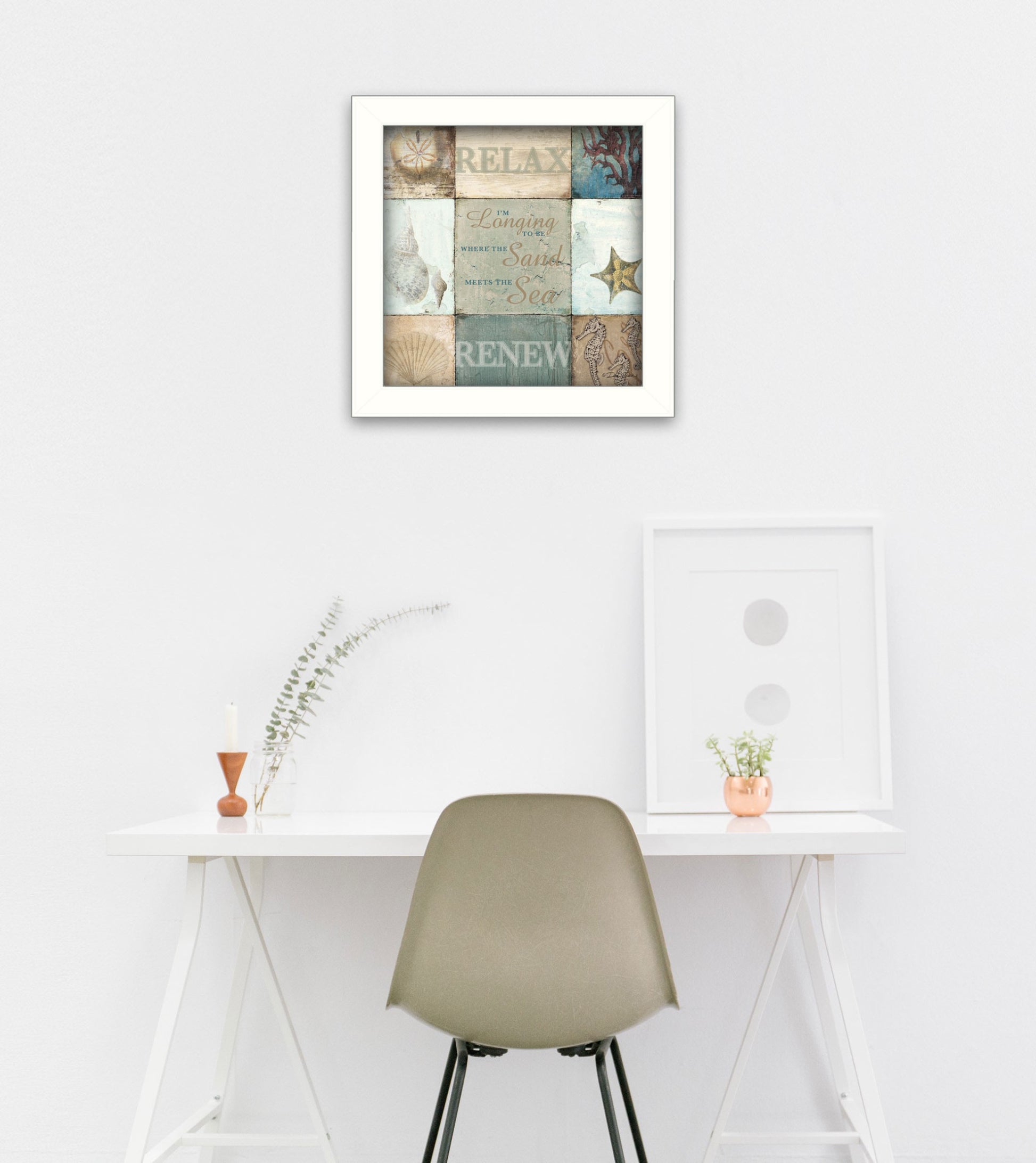 Add an air of fashion to your room and rejuvenate the space with this sand and sea white framed print wall art. This print is a visual artistic expression that allows you to decorate your space in style. Reproduced for you on paper, this hanging decorative accent will be a trendy and fashionable way to dress your walls. Hang on your wall to add some up to date fashion and decoration. Instantly liven up your space with this art that brings color and dimension to your walls. 14 inches H x 14 inches W x 1 inches D