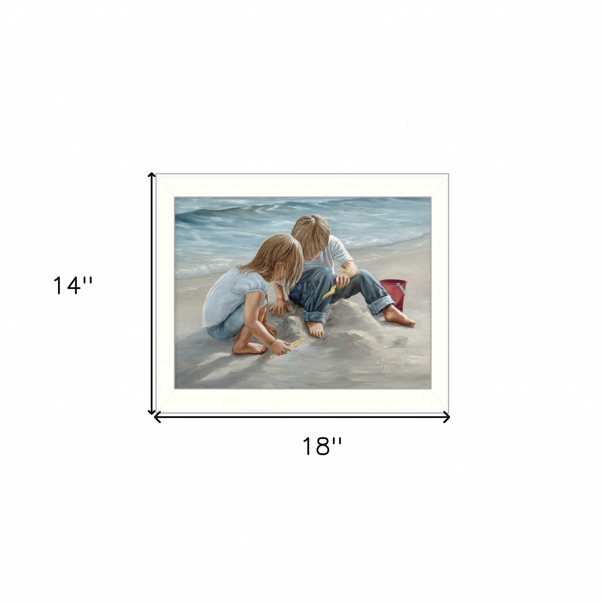 Bring some sizzle to your space with this eye-catching sand castle builders 1 white framed print wall art. This print is a visual artistic expression that allows you to decorate your space in style. Reproduced for you on paper, this hanging decorative accent will be a trendy and fashionable way to dress your walls. Adding this hanging wall art to your space to make your room feel more finished and attractive. Utilize this opportunity to create a focal point in the room with this fabulous wall decor option. 18 inches H x 14 inches W x 1 inches D