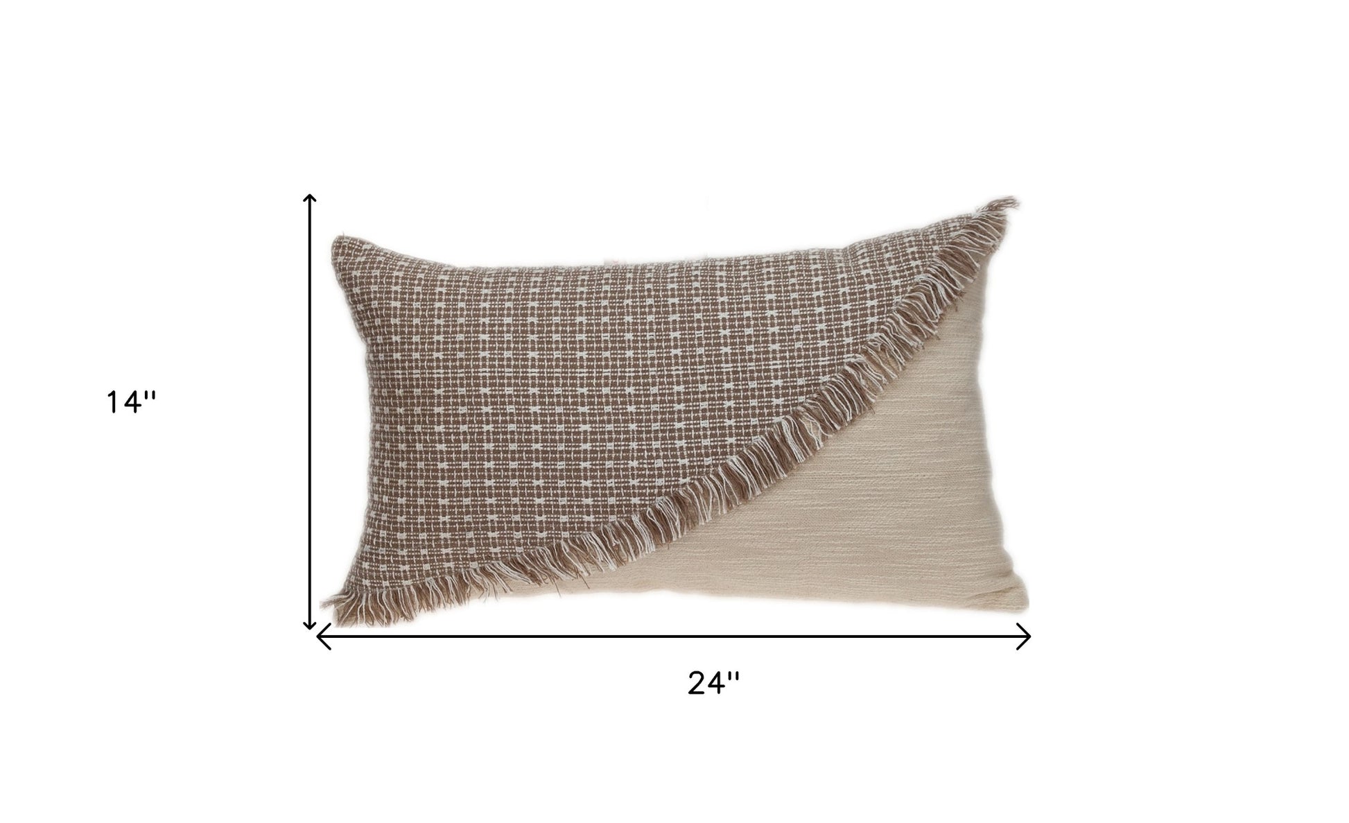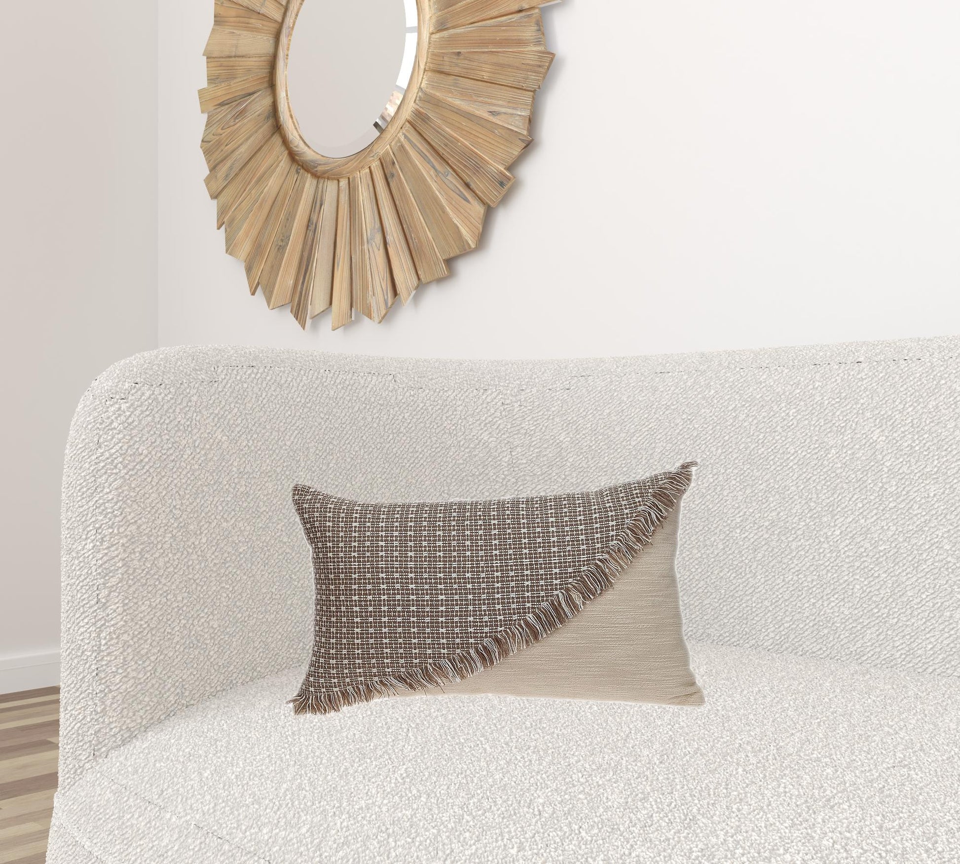 Escalate your cozy living room into something trendy yet rustic with this Sandy Beige Textured Throw Pillow. The sandy beige color of the pillow gives it an earthy look and feel, while the texture and fringes contribute to its style meter. This is a 100% cotton pillow that needs dry cleaning or spot cleaning.