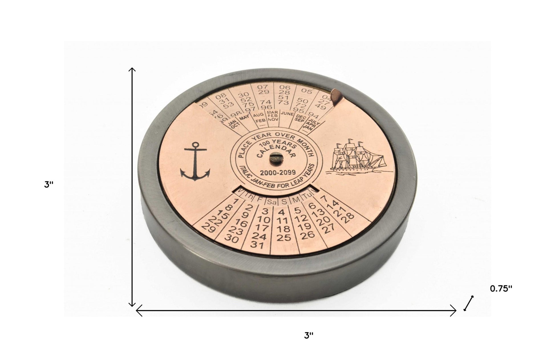This is set of two functional elegant pieces: a 100 year Calendar and a Compass Quote. The calendar features a brilliant way to track for dates starting from the year 2000 to 2099. The calendar features authentic hand carved and painted numbers and drawings on it. The compass on the other hand features a beautiful quote A journey of a thousand miles must begin with a single step. Both items are made of high quality brass with each component is crafted using the finest craftsmanship. They are available in antique brass finish and are shipped together in one package. Together both would make a great addition to any nautical collection. 100 year Calendar dimension: L: 3.75 inches, W: 3.75 inches, H: 0.5 inches. Compass Quote dimension: L: 3 inches, W: 3 inches, H: 0.75 inches." 3" x 3"