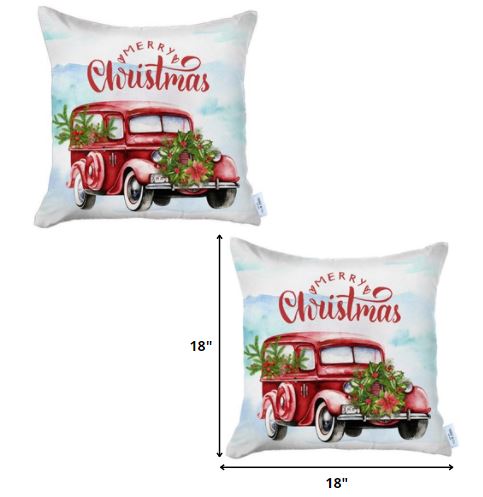 Bring some Christmas fun and folly to your space with the Merry Christmas Vintage Red Car Printed Thow Pillows. Crafted in a super soft brushed polyester, this square Throw Pillow has high-quality digital printing on the front while the backside is a solid natural color. There is a hidden zipper closure that gives a clean and seamless look all the way around. The removable and super soft pillow insert is filled with high-quality polyester that is designed to resist clumping and matting to provide maximum comfort and softness. 18" X 18" each. Set of 2.
