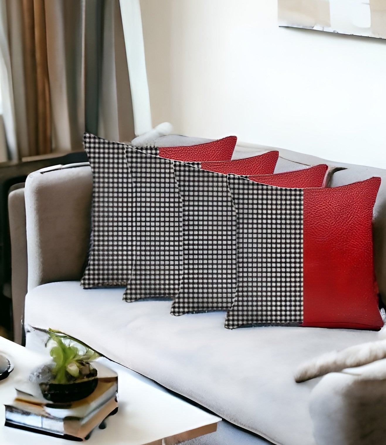 This Set of 4 Red Faux Leather Pillow Covers kindles a strong first impression with its two-toned design pattern. Bisected with an apple red vegan faux leather on one half and a classy houndstooth pattern in jacquard weaving on the other to create a visually striking contrast. Accentuating class and quality with OEKO-TEX Standard 100 certification and comprises polyester faux leather in the making to ensure durability and product safety while allowing only spot cleaning. The all-around hidden zipper closure gives the cover a refined finish that feels luxurious on the touch. Pair this exclusively designed set of 4 pillow covers with any vibrant or neutral interior decor and it will beautifully blend in with its surrounding. 18” x 18” each. Set of 4.