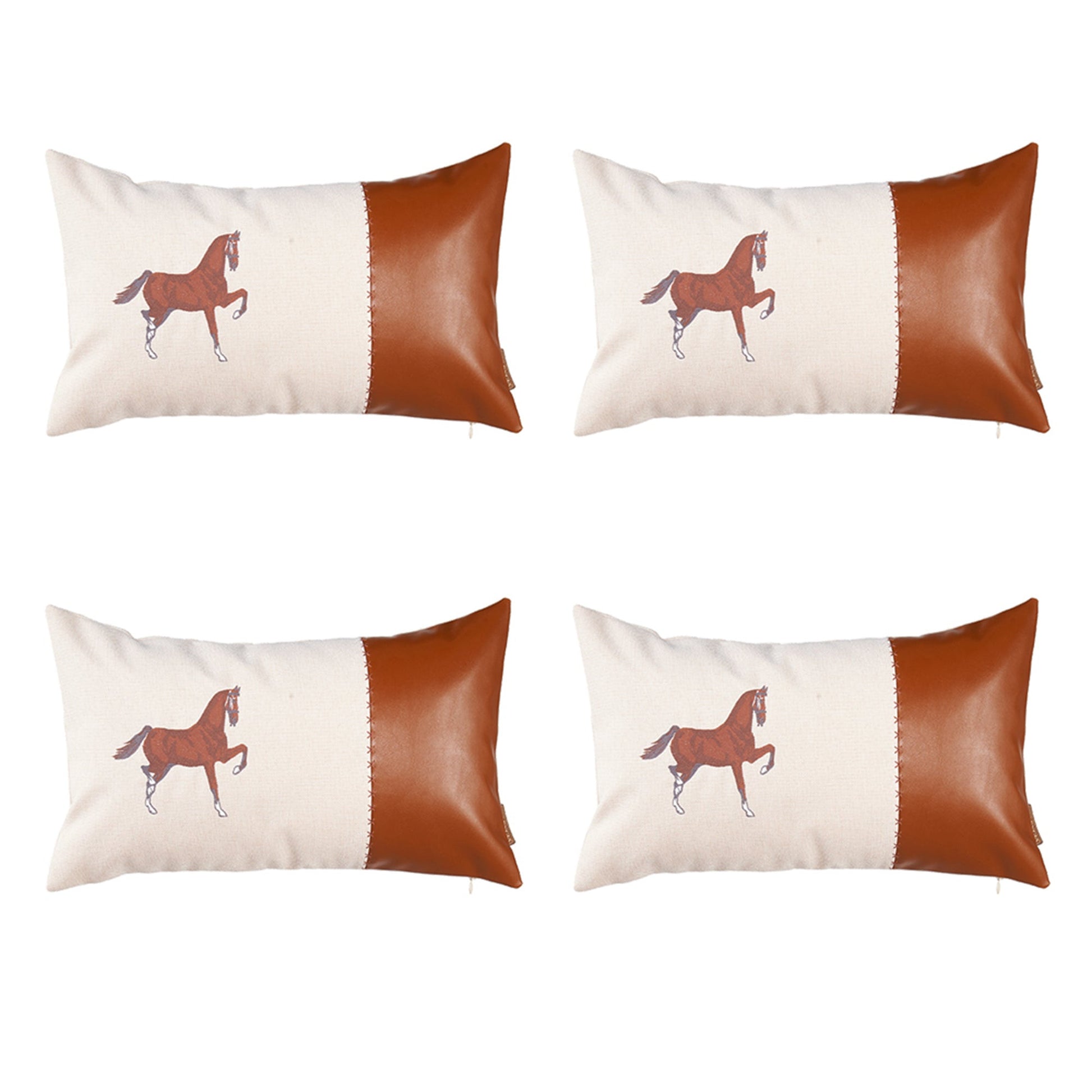Set Of Four 20" X 12" Beige And Brown Horse Faux Leather Zippered Pillow With Embroidery