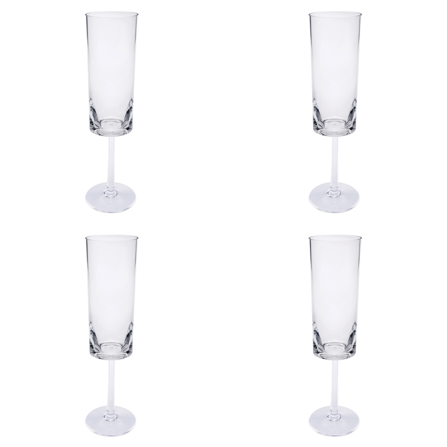Add a distinctive touch to your drinkware collection with this beautiful set of four clear acrylic stemmed flutes. Elevate any occasion with a set of stunning stemware that is as functional as it is beautiful. The graceful stem adds an air of sophistication to your favorite beverage. Beautifully machine embossed to give your glassware a bit of design, character, and dimension. Simplicity at its finest, this smooth surface is refined without texture. Every drink deserves the perfect glass, and so do you. 8.46-inch H x 1.96-inch W x 1.96-inch D