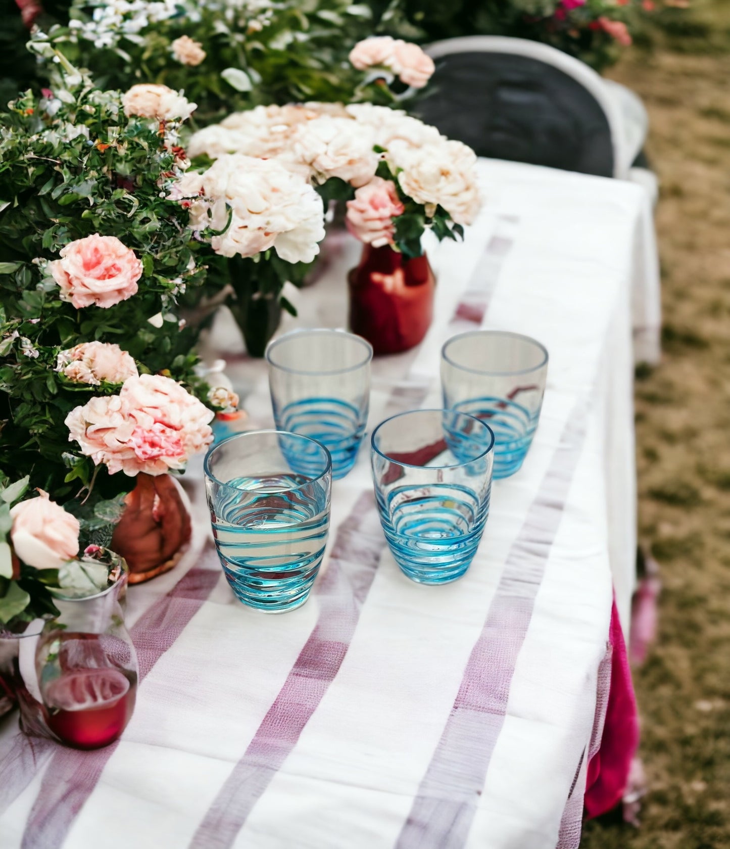 The set of four clear and blue acrylic stemless whiskey glasses is a good-looking glass to use for your favorite whiskey but can also be used for most any other drink or beverage. Whether you are entertaining or simply enjoying a drink by yourself, a quality set of stemware is a must-have. Includes a decorative clear rim to enhance the look and elegance of the glass. Beautifully machine embossed to give your glassware a bit of design, character, and dimension. The texture on this surface not only looks great but feels cool in your hand. Every drink deserves the perfect glass, and so do you. 4.5-inch H x 3.63-inch W x 3.63-inch D