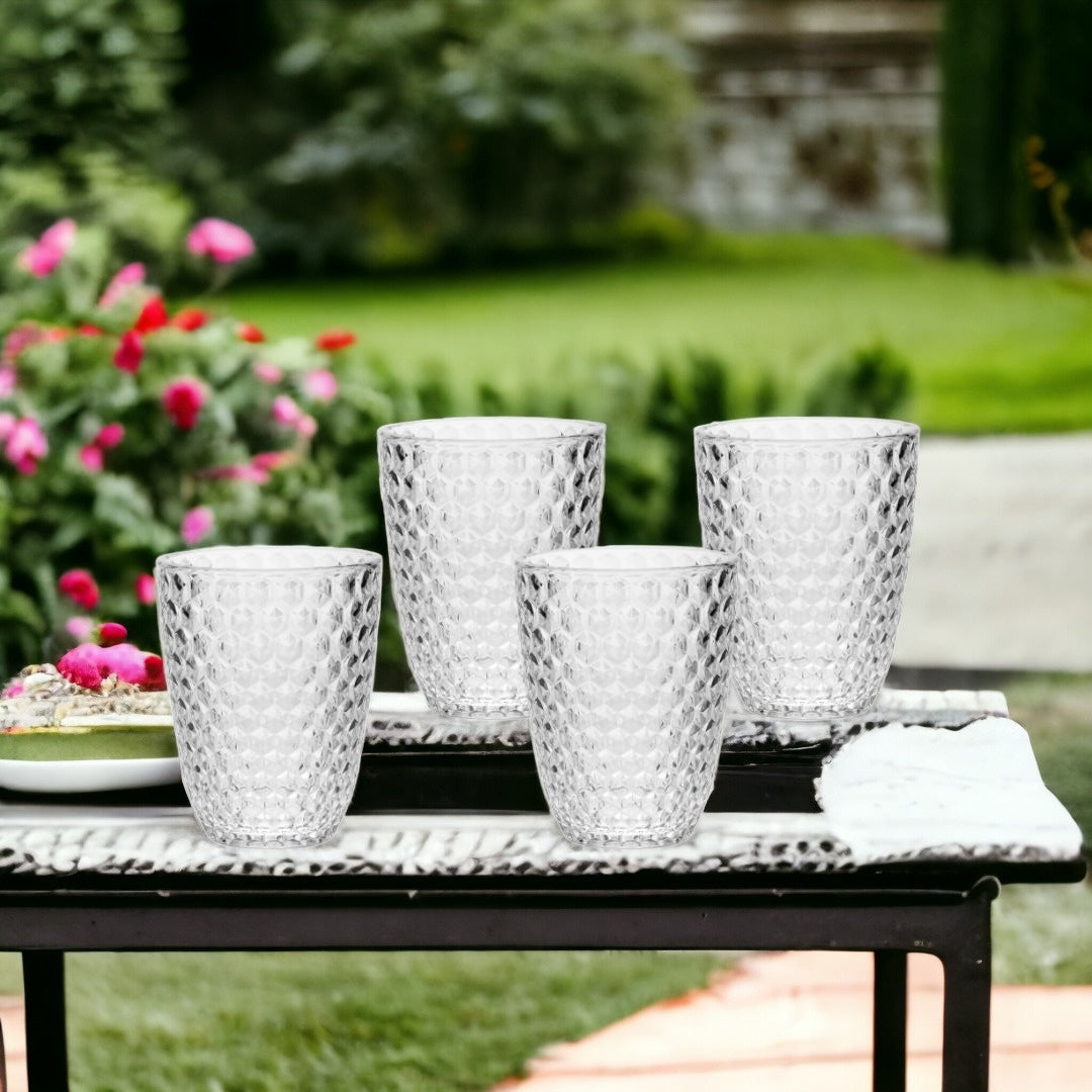 The set of four clear diamond acrylic stemless whiskey glasses is a good-looking glass to use for your favorite whiskey but can also be used for most any other drink or beverage. Elevate any occasion with a set of stunning stemware that is as functional as it is beautiful. The addition of a machine embossed design gives this glass special character and dimension. Add iconic style to your setting with this good looking diamond pattern. The texture on this surface not only looks great but feels cool in your hand. Sipping from the right glass can make the difference between a drink and an amazing experience. 4.25-inch H x 3.38-inch W x 3.38-inch D