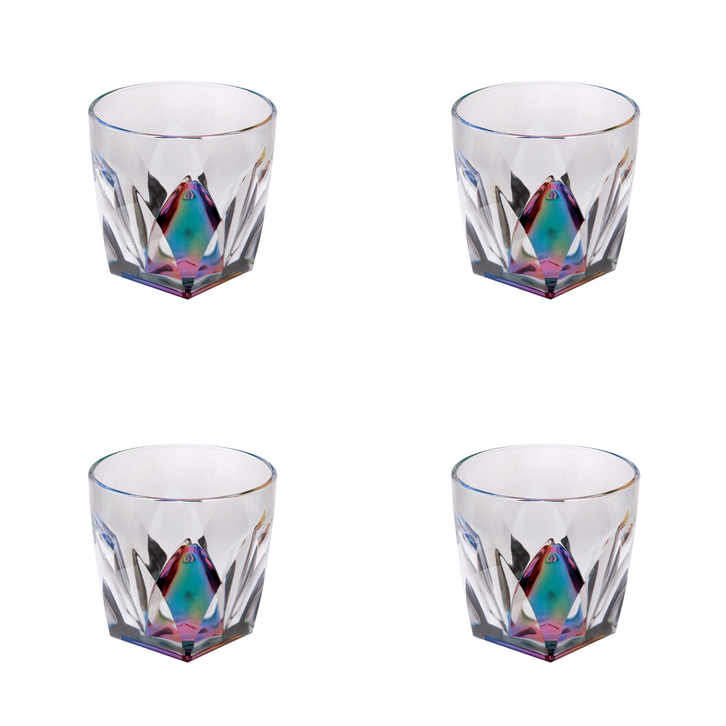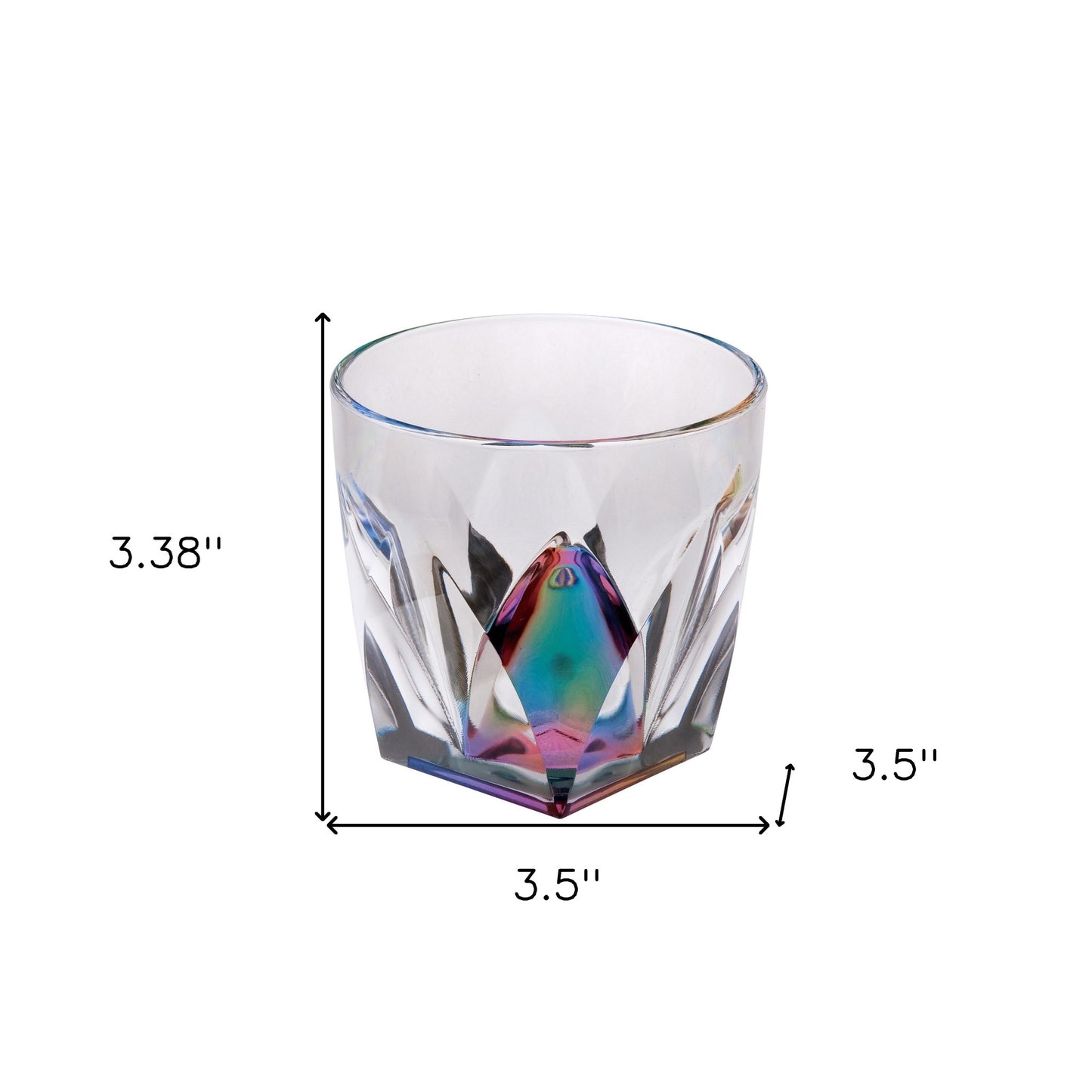 Add a touch of elegance and class to your drinkware collection with this set of four rainbow geometric acrylic stemless whiskey glass. Whether you are entertaining or simply enjoying a drink by yourself, a quality set of stemware is a must-have. Add an air of casual elegance with the fresh and modern design of a stemless glass. Includes a decorative clear rim to enhance the look and elegance of the glass. The addition of a machine embossed design gives this glass special character and dimension. Add iconic style to your setting with this good looking geometric pattern. The texture on this surface not only looks great but feels cool in your hand. Every drink deserves the perfect glass, and so do you. 3.38-inch H x 3.5-inch W x 3.5-inch D