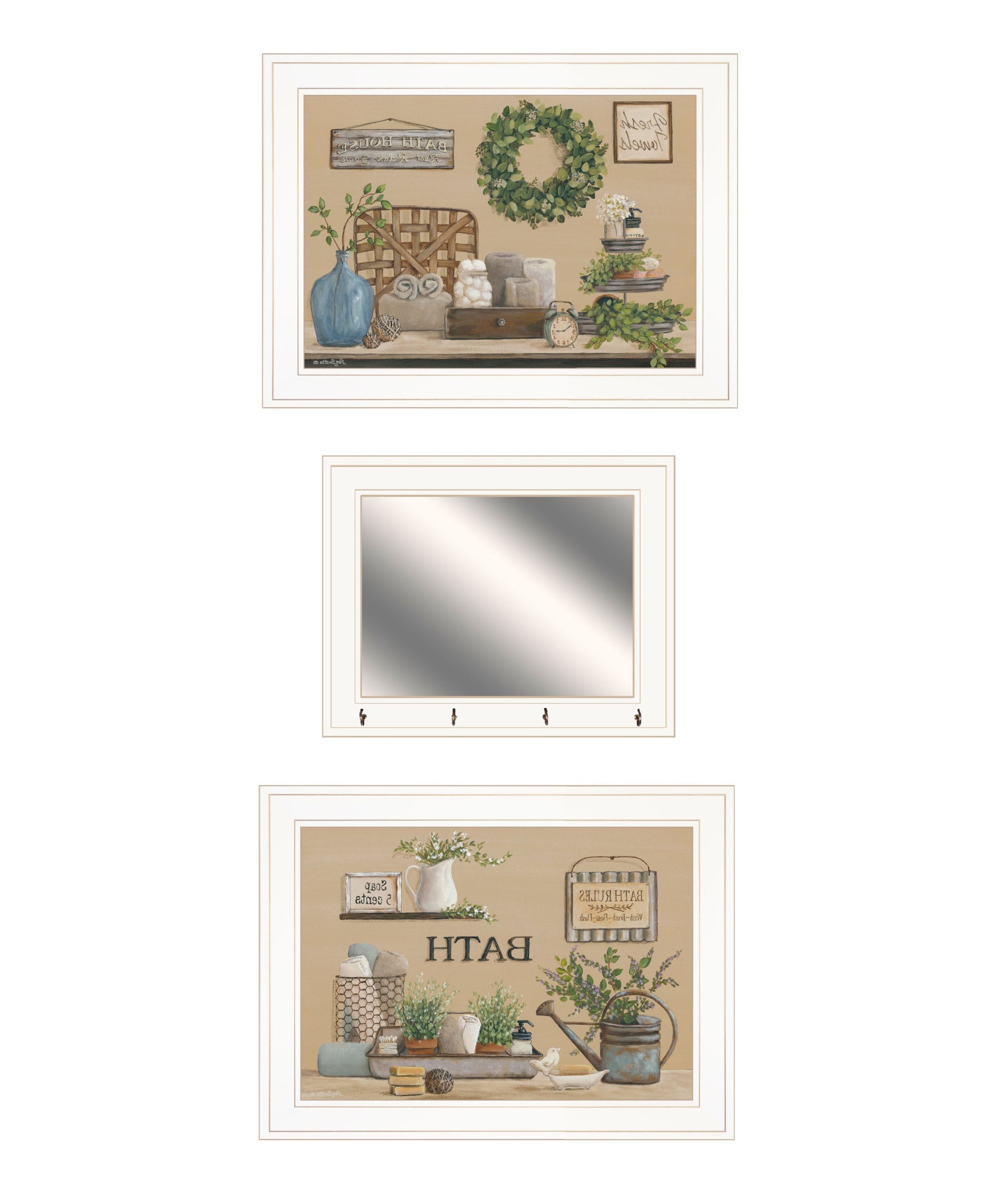 Bring some sizzle to your space with this eye-catching set of three bath time 1 white framed print bathroom wall art with mirror. This print is a visual artistic expression that allows you to decorate your space in style. Reproduced for you on paper, this hanging decorative accent will be a trendy and fashionable way to dress your walls. Hang on your wall to add some up to date fashion and decoration. Utilize this opportunity to create a focal point in the room with this fabulous wall decor option. 15 inches H x 19 inches W x 1 inches D