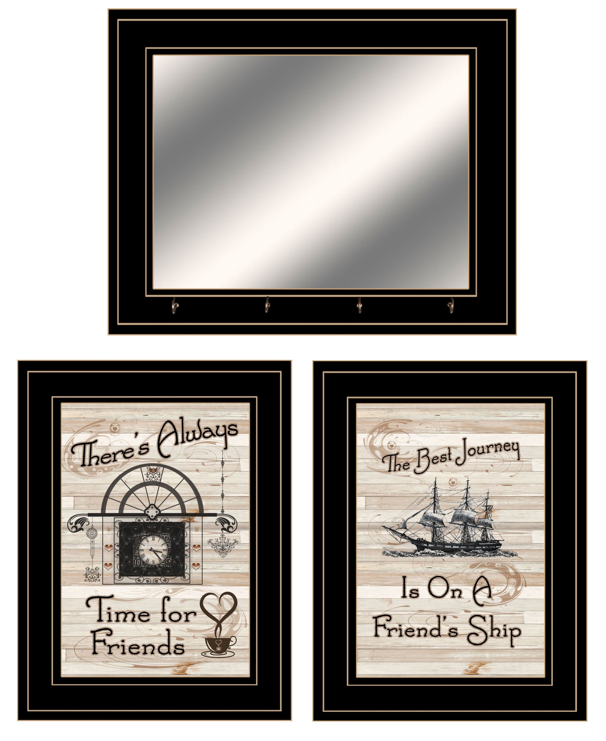 The set of three friendship journey 7 black framed prints and mirror with hooks is the perfect decorative accessory for your home. This print is a visual artistic expression that allows you to decorate your space in style. Reproduced for you on paper, this hanging decorative accent will be a trendy and fashionable way to dress your walls. Hang on your wall to add some up to date fashion and decoration. Instantly liven up your space with this art that brings color and dimension to your walls. 12 inches H x 15 inches W x 1 inches D
