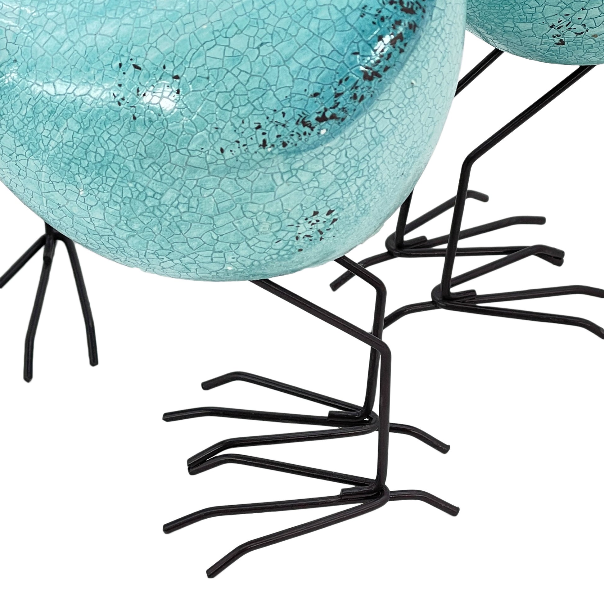 Unique and decorative, this set of three robins egg blue and black bird sculptures will leave a lasting impression. This charming decorative set is expertly made of high grade polyresin in a robins egg blue and black coloration. Purposefully distressed and finished with a gorgeous crackle glaze, these birds are a bright and cheerful way to decorate your space. Makes a great tabletop accent for your coffee table, counter, bookshelf, mantle, or even dining table. It's a perfect addition for those who love an up-to-the-minute look and feel. 9.5-inch H x 3.2-inch W x 5.5-inch D