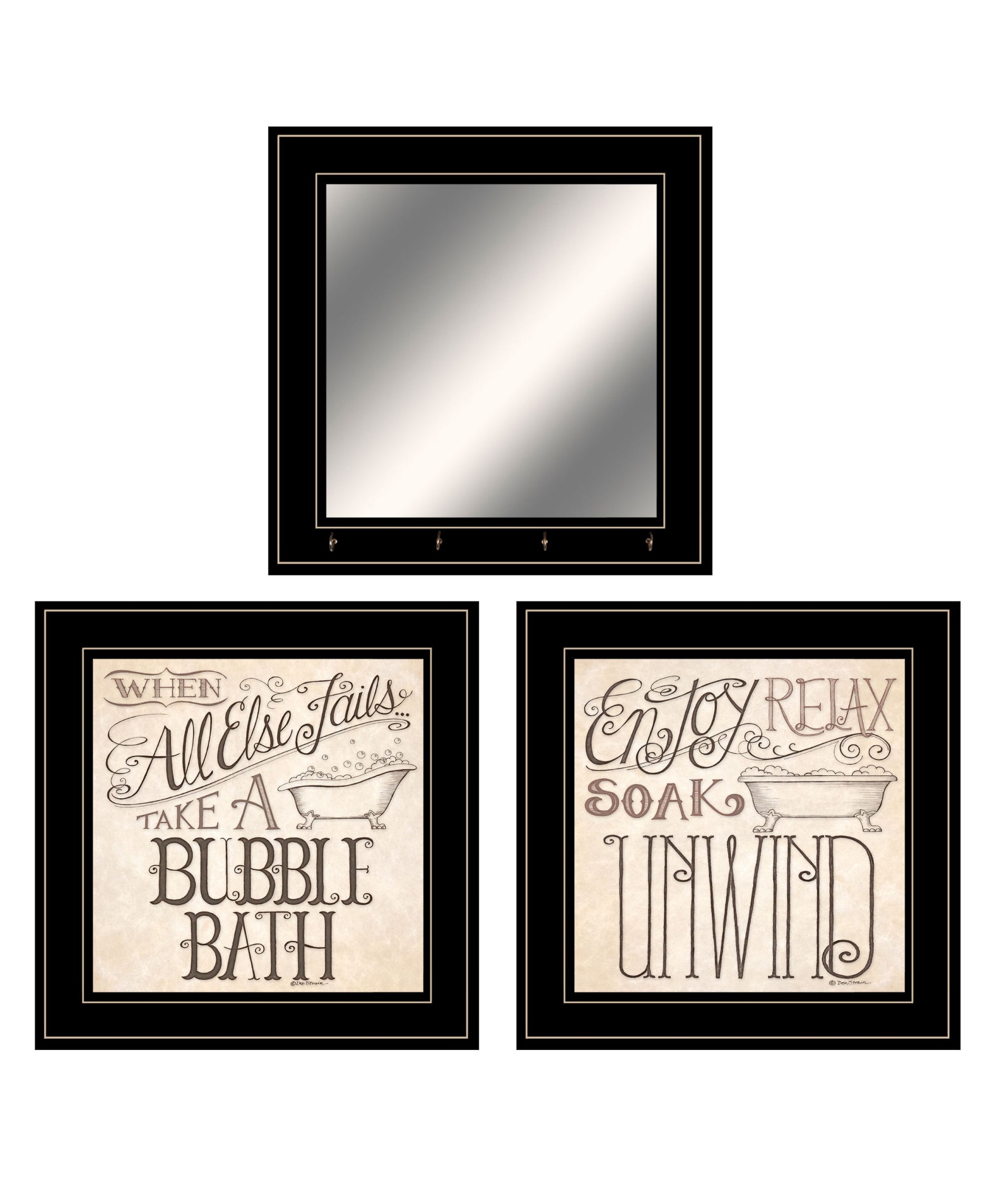 Unique and decorative, this set of three soak and unwind 5 black framed print bathroom wall art will leave a lasting impression. This print is a visual artistic expression that allows you to decorate your space in style. Reproduced for you on paper, this hanging decorative accent will be a trendy and fashionable way to dress your walls. Adding this hanging wall art to your space to make your room feel more finished and attractive. Utilize this opportunity to create a focal point in the room with this fabulous wall decor option. 15 inches H x 15 inches W x 1 inches D