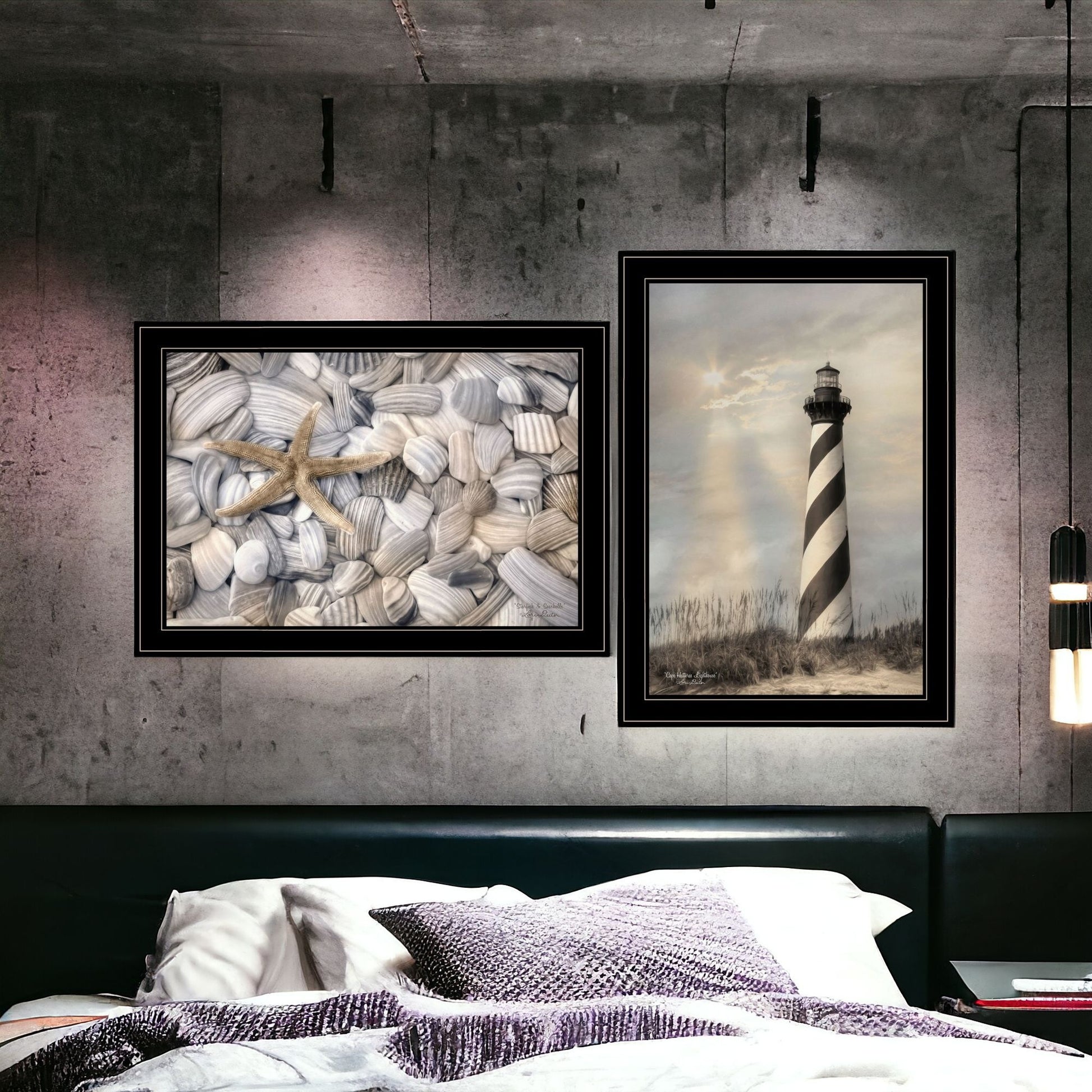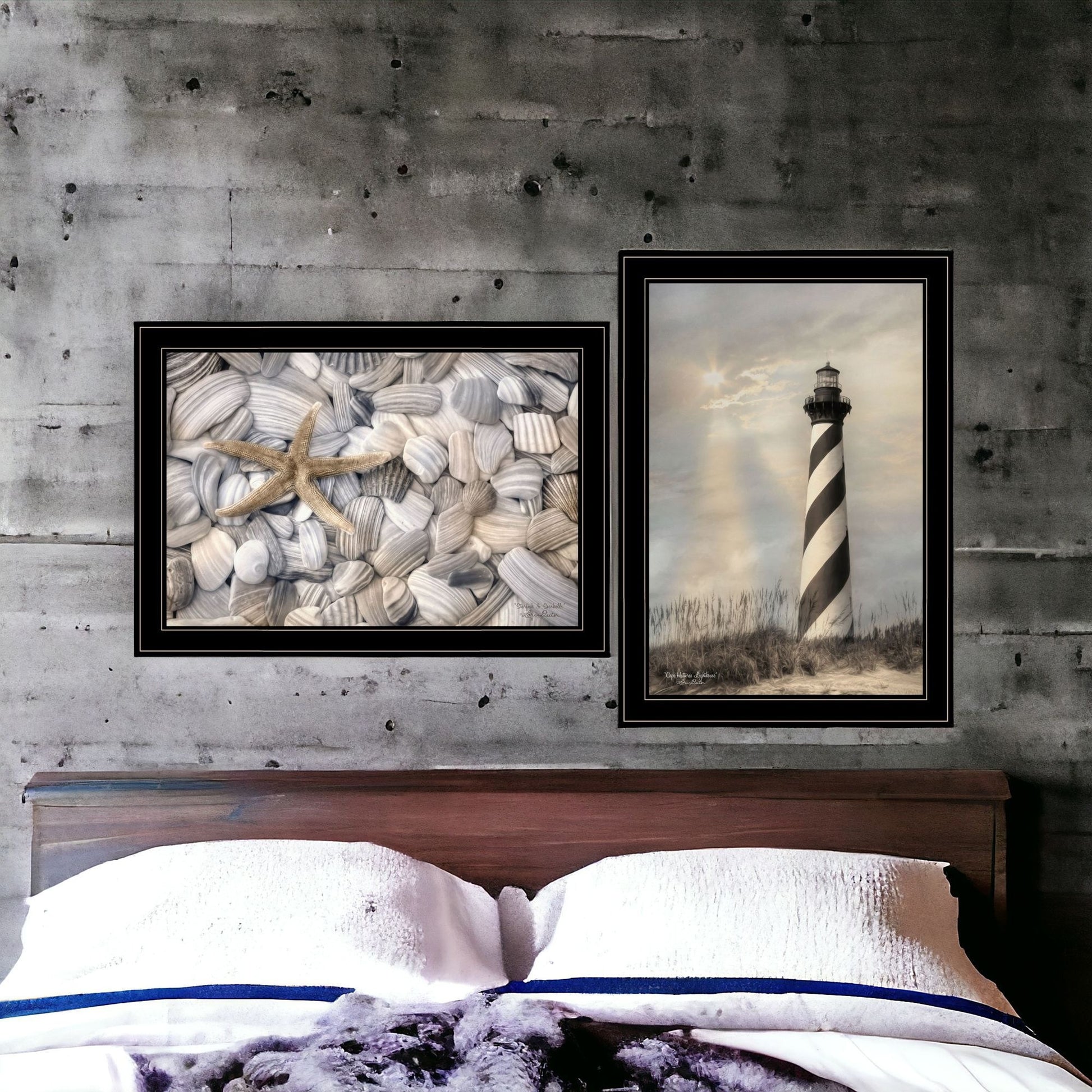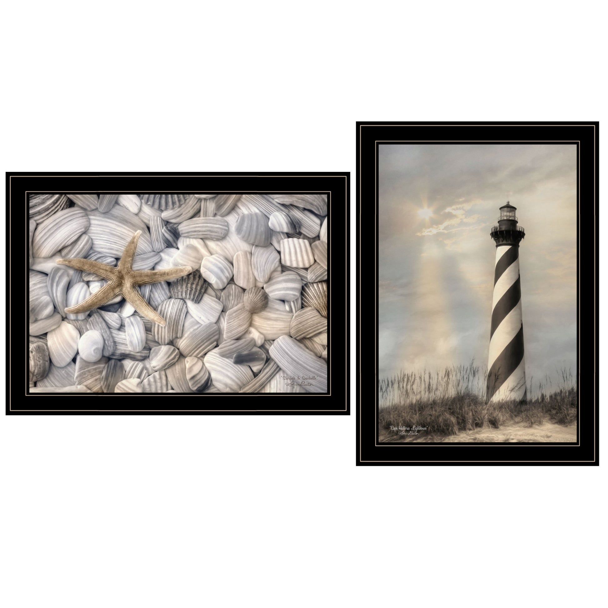 Add an air of fashion to your room and rejuvenate the space with this set of two cape hatteras lighthouse and sea shells 4 black framed print wall art. This print is a visual artistic expression that allows you to decorate your space in style. Reproduced for you on paper, this hanging decorative accent will be a trendy and fashionable way to dress your walls. Adding this hanging wall art to your space to make your room feel more finished and attractive. Utilize this opportunity to create a focal point in the room with this fabulous wall decor option. 15 inches H x 21 inches W x 1 inches D