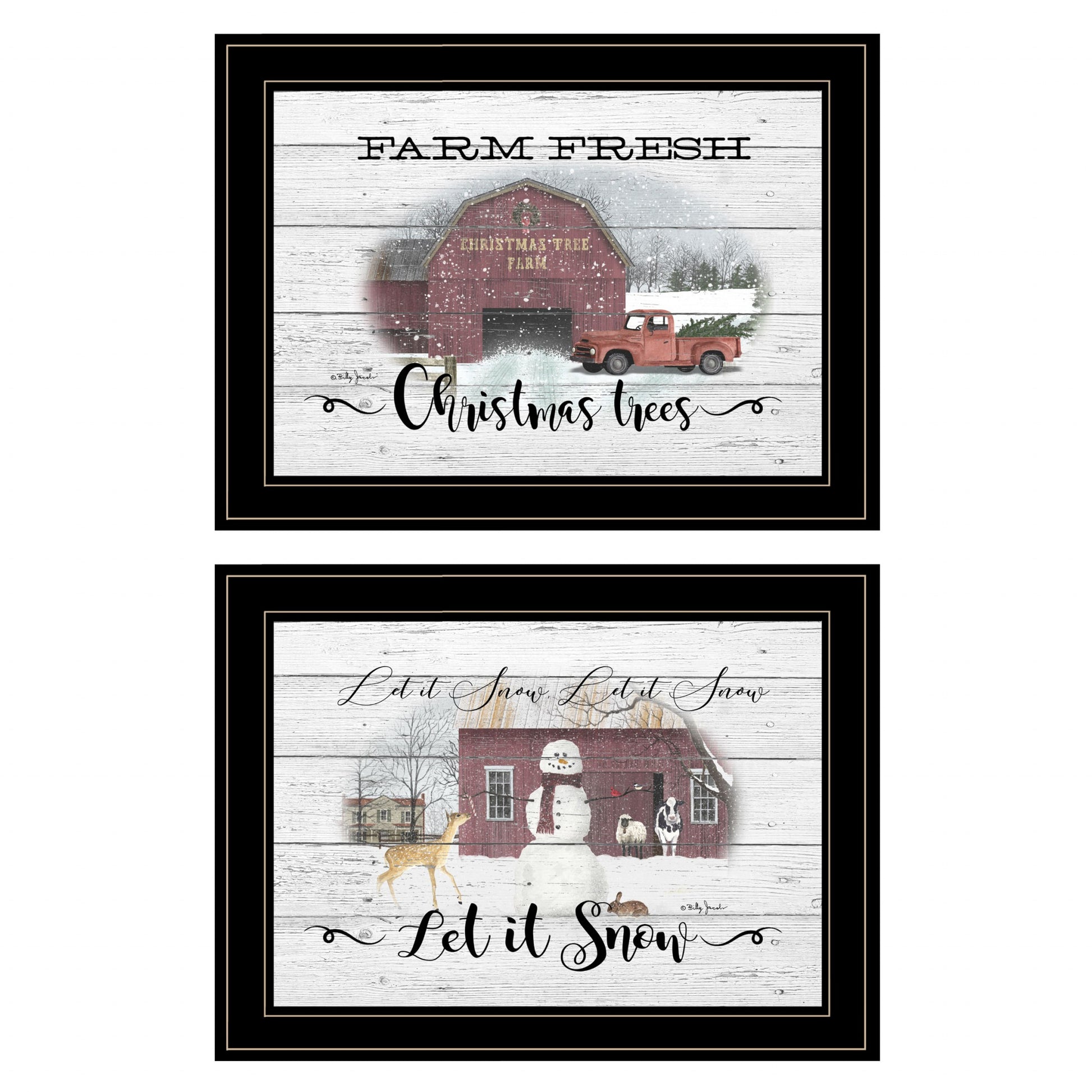 Set Of Two Farm Christmas Trees and Snow Black Framed Print Wall Art