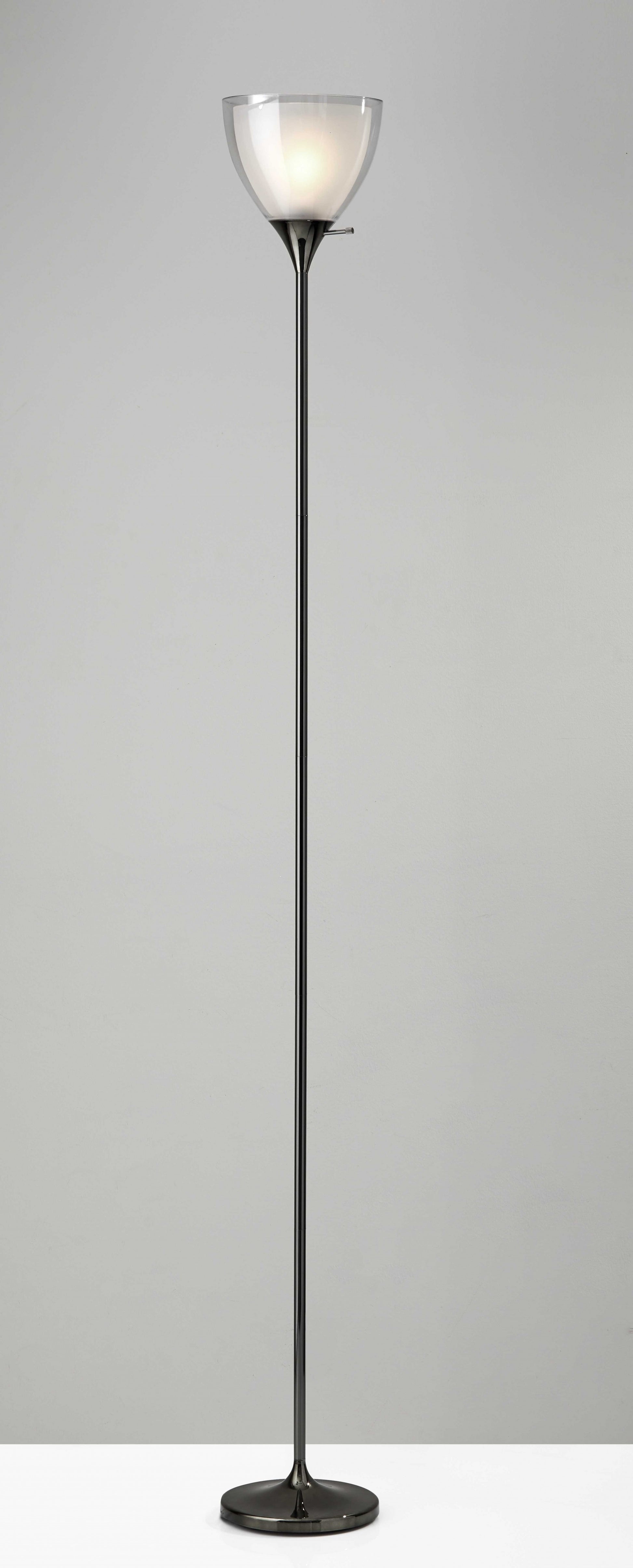 Illuminate your home with this classic, sophisticated floor lamp. This torchiere floor lamp, with an 8" diameter, can fit into any corner of the room. A 150 Watt bulb is controlled by a 3-way rotary switch below the shade. A clear plastic outer shade covers a frosted inner shade to create a unique glow when lit. A black nickel finish and a slim silhouette contribute to this modern style. A 3-way rotary socket switch will only work with a 3-way light bulb, otherwise, this lamp will function with a simple on/off switch at its highest setting. This lamp is smart outlet compatible. Bulb is not included.