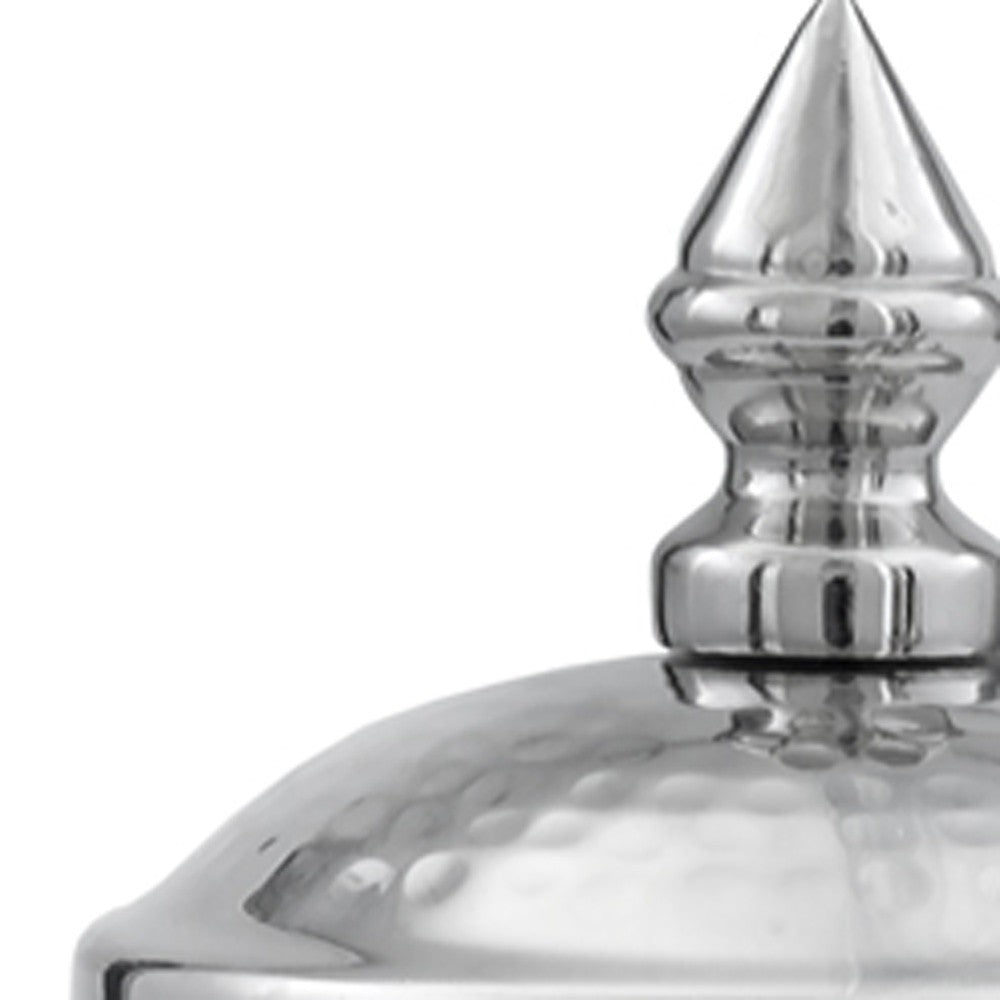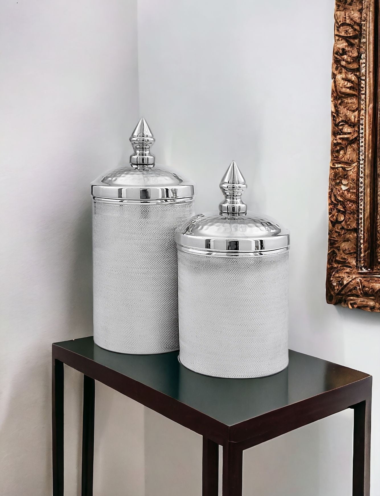 Upgrade the style of your home with a classy and grand feel, and brighten up your space with this mesmerizing and fabulous silver canister. It will definitely be the center of attention. Additionally, this silver canister will definitely show off how great your sense of style is. This silver canister is a high grade piece, which will make your rooms look so much greater. With this exceptional silver canister, you'll leave a long-lasting impression on all who see it, while also creating a momentous effect in the ambiance of your rooms. It's a perfect addition for those who love a modern look and feel. This silver canister is both good looking and hard wearing, and will last you for a long time. This charming silver canister is expertly made of high grade materials. As for measurements, they are 11" for height, 4.5" for width, 4.5" for depth and 1.65 pounds for weight. You can mix it with other decorations to create the perfect look. This is a set of two.