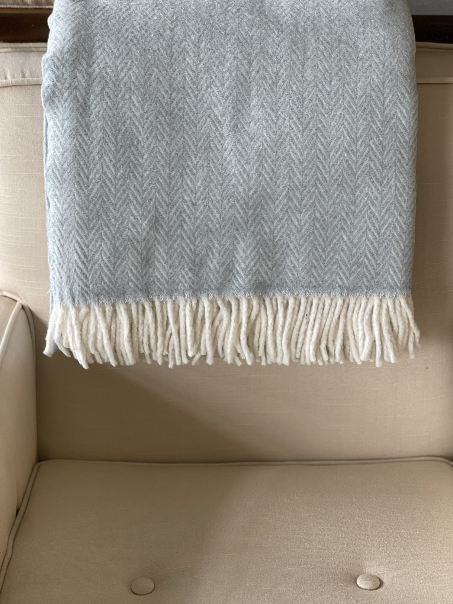 Experience high-end luxury when you wrap yourself in this Sky Blue and White Dreamy Soft Herringbone Throw Blanket. This fabulously soft European woven throw has a classic herringbone design on both sides and a fun white fringe on each end. This super-soft cotton acrylic blend throw will be a luxurious way to accent your sofa, chair, or bed with the perfect accent blanket. This blanket is a great accompaniment to a warm cup of coffee or glass of wine in your favorite spot by the fire. 70" x 55"