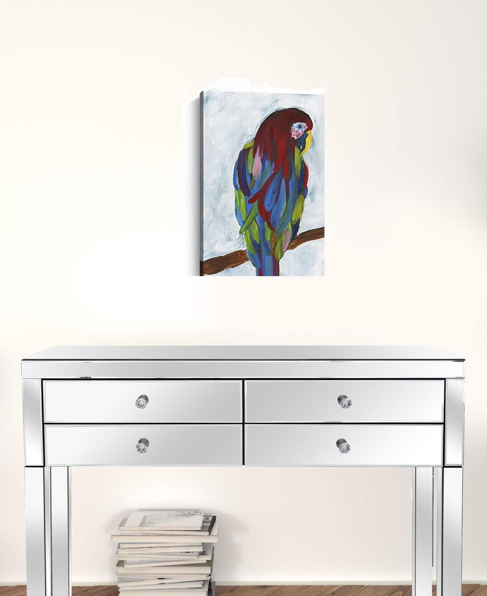 Add an air of fashion to your room and rejuvenate the space with this small bright and tropical parrot canvas wall art. This print is a visual artistic expression that allows you to decorate your space in style. Reproduced for you on canvas, this hanging decorative accent will be a trendy and fashionable way to dress your walls. Hang on your wall to add some up to date fashion and decoration. Instantly liven up your space with this art that brings color and dimension to your walls. 20 inches H x 16 inches W x 1.25 inches D