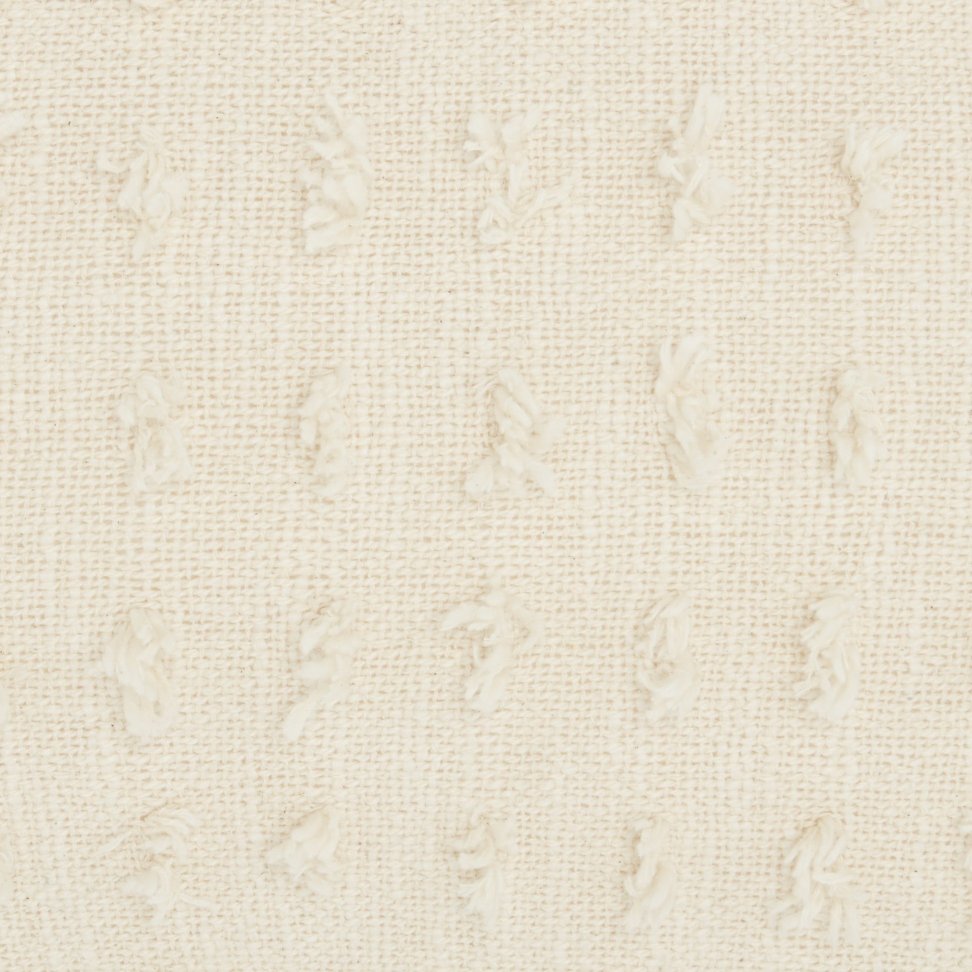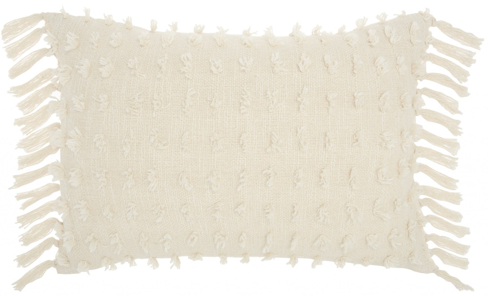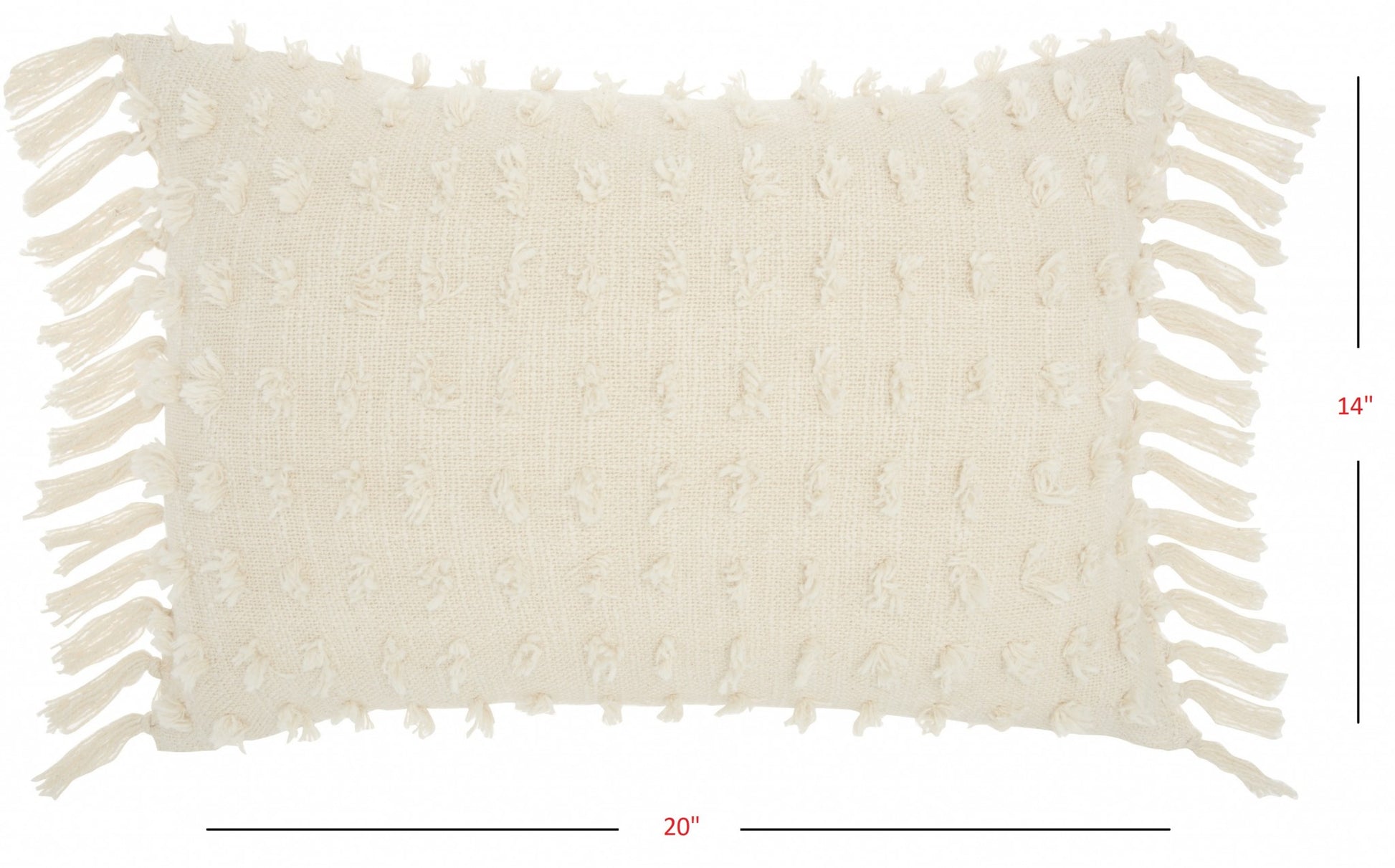 Bring in a touch of textural design to your living room aesthetic with this Tassel Detailed White Lumbar Pillow. The soft Polyester filling is covered with a textured cotton fabric that has a stunning white color. This serves as the perfect background for small dot details on top. The details are handcrafted with white colored thread to invoke a sense of depth. Adding the finishing touch are long tassels on either side made with the same white threads and giving a more boho chic look. Use this pillow everyday or display it on your favorite chair as an accent piece. 5" H x 14" W x 20" D