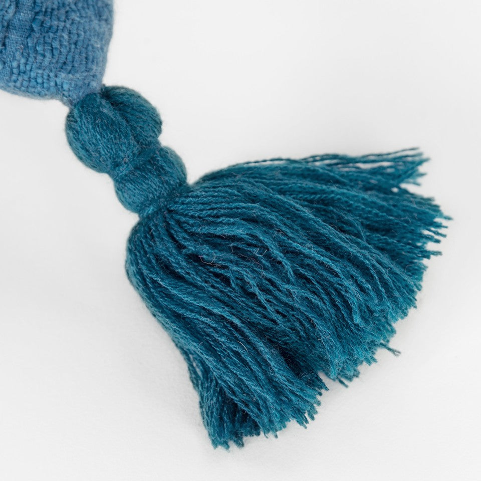 Sophisticatedly modern with a bohemian flair, this Teal Solid Tonal Abstract Stripe Throw Pillow is an episode of style and simplicity to spruce up your living space. The solid teal blue base features slightly raised abstract stripe patterning for texture while the four cotton corner tassels add a cheerful element to the pillow. Crafted from top-quality cotton fabric for enhanced durability and the polyfill insert makes it super soft, fluffy, and cuddly. The knife edging on the pillow ensures a clean and modern look to make it a suitable accent for a variety of interior styles. The solid coordination back sports a hidden zipper closure for convenience. Give your modern home a stylish visual appeal with this decorative throw pillow on the sofa or couch. 20” x 20” x 6.25”