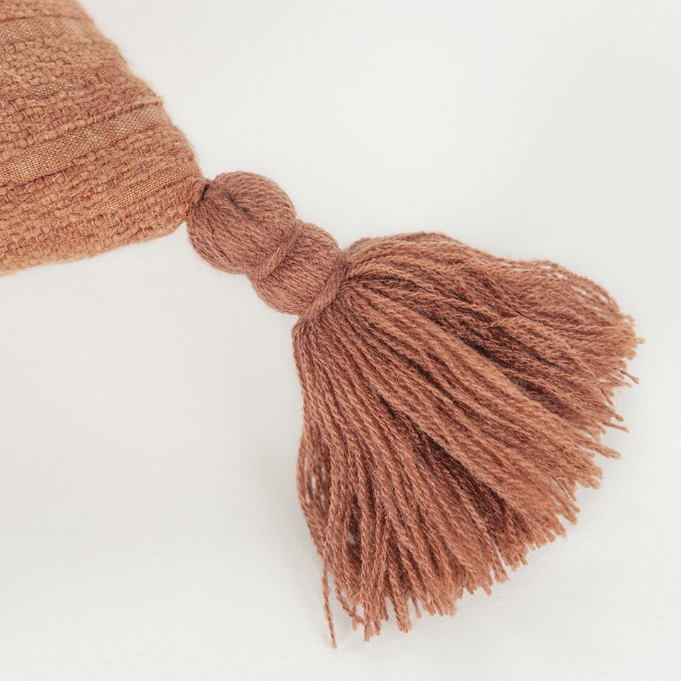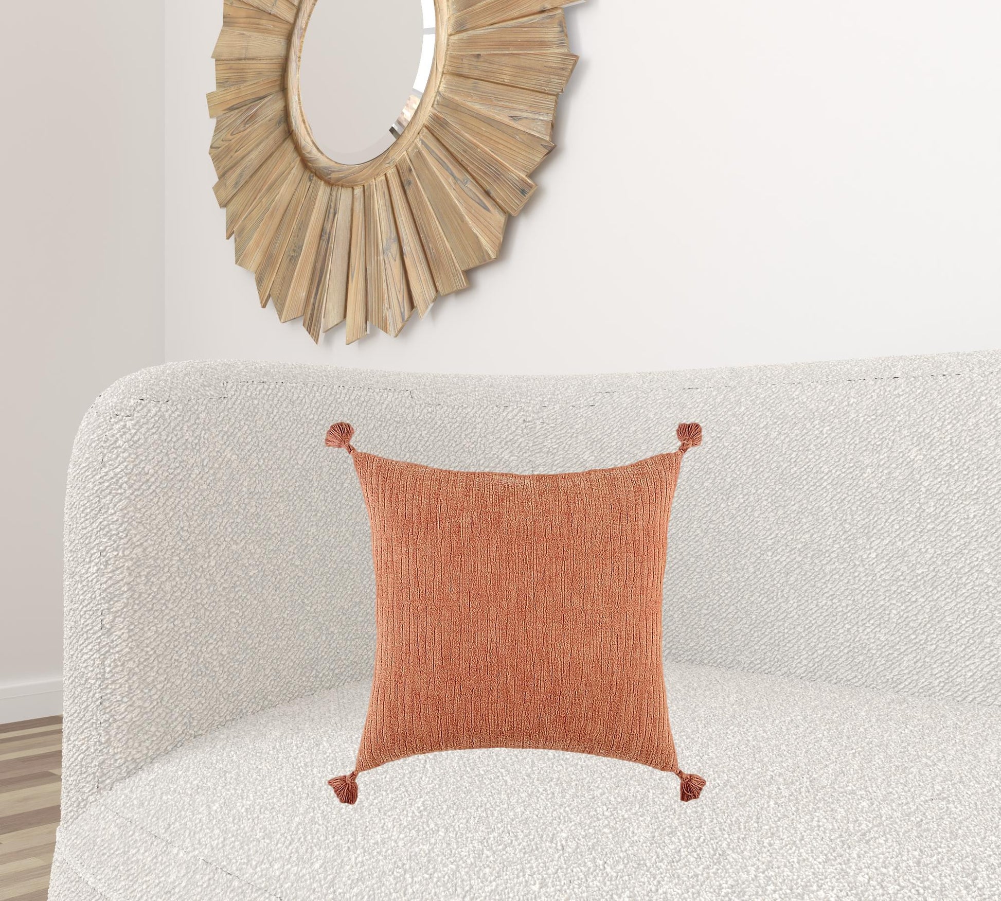 Sophisticatedly modern with a bohemian flair, this Terracotta Solid Tonal Abstract Stripe Throw Pillow is an episode of style and simplicity to spruce up your living space. The solid terracotta base features slightly raised abstract stripe patterning for texture while the four cotton corner tassels add a cheerful element to the pillow. Crafted from top-quality cotton fabric for enhanced durability and the polyfill insert makes it super soft, fluffy, and cuddly. The knife edging on the pillow ensures a clean and modern look to make it a suitable accent for a variety of interior styles. The solid coordination back sports a hidden zipper closure for convenience. Give your modern home a stylish visual appeal with this decorative throw pillow on the sofa or couch. 20” x 20” x 6.25”