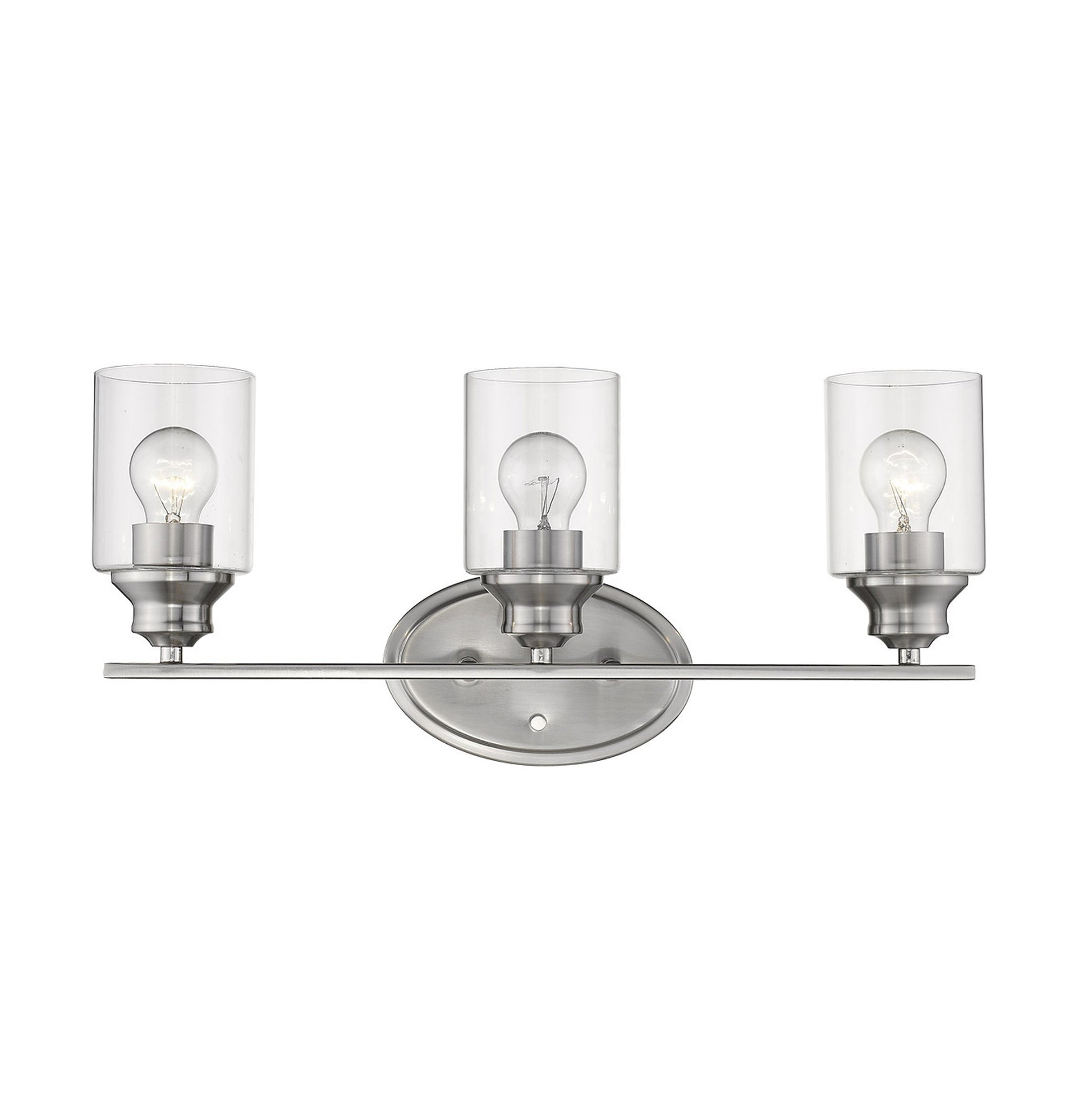 Add depth to your minimalist aesthetic while adding brightness to your space with this Three-Light Silver Wall Light with Clear Glass Shade. The wall bracket has a general oval shape with beveled edges and is colored to a silver finish. Attached to it are two small rods that hold the flat rod up on top of which the three lights sit. The base of each light is two-tiered and is colored to the same silver finish. The shades are made of clear glass and have a wide cylindrical shape. The contrast between the clear glass and matte black hardware gives this wall light a very unique look. Use it anywhere in your home and elevate the look of any space. 9.88" H x 22" W x 5.75" D
