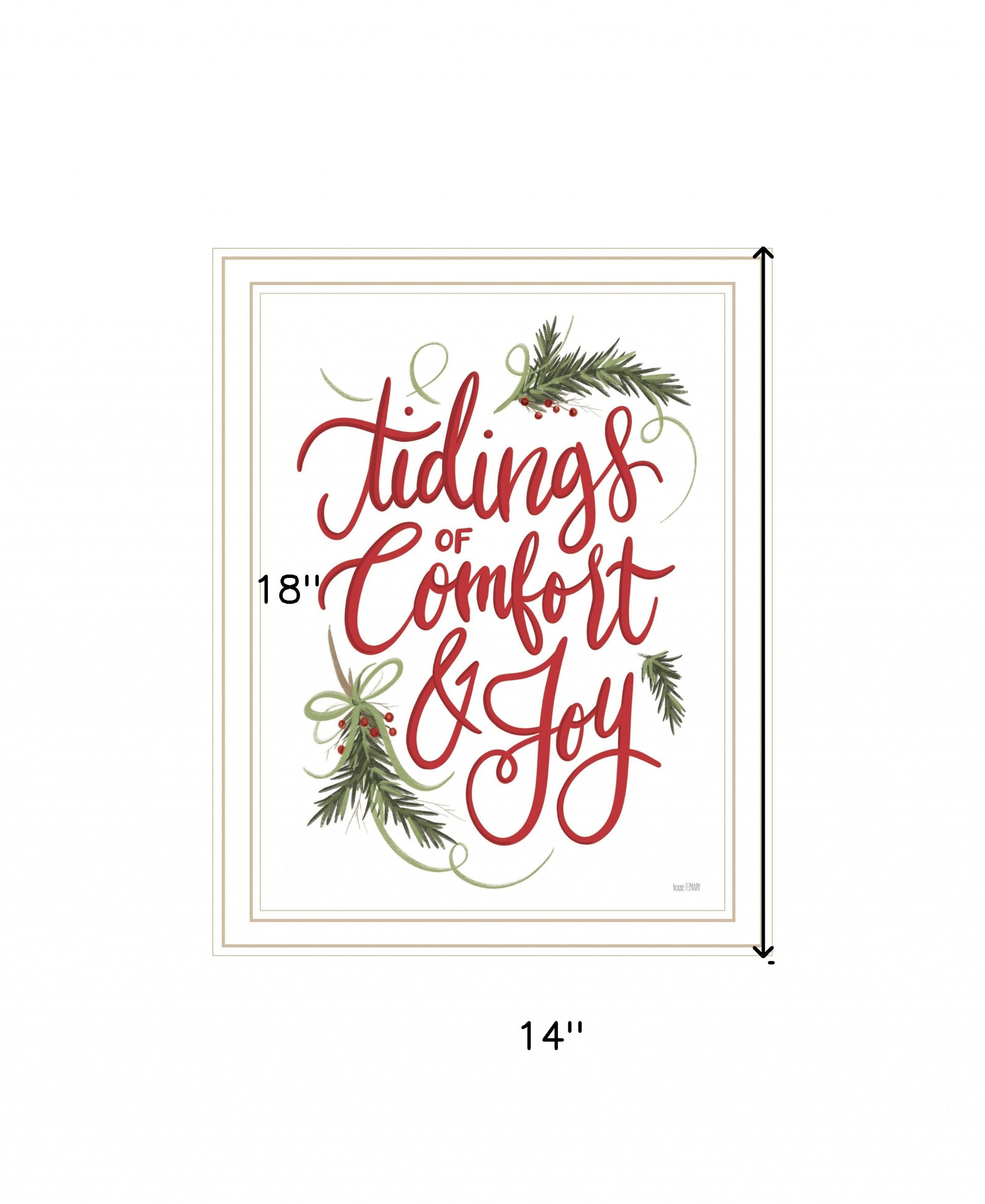 Unique and decorative, this tidings of comfort & joy 1 white framed print wall art will leave a lasting impression. This print is a visual artistic expression that allows you to decorate your space in style. Reproduced for you on wood, this hanging decorative accent will be a trendy and fashionable way to dress your walls in a rustic and modern farmhouse vibe. Hang on your wall to add some up to date fashion and decoration. Instantly liven up your space with this art that brings color and dimension to your walls. 18 inches H x 14 inches W x 1 inches D
