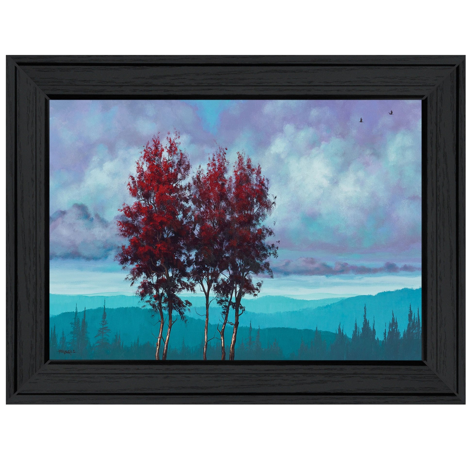 Unique and decorative, this two red trees 2 black framed print wall art will leave a lasting impression. This print is a visual artistic expression that allows you to decorate your space in style. Reproduced for you on paper, this hanging decorative accent will be a trendy and fashionable way to dress your walls. Hang on your wall to add some up to date fashion and decoration. Instantly liven up your space with this art that brings color and dimension to your walls. 15 inches H x 21 inches W x 1 inches D