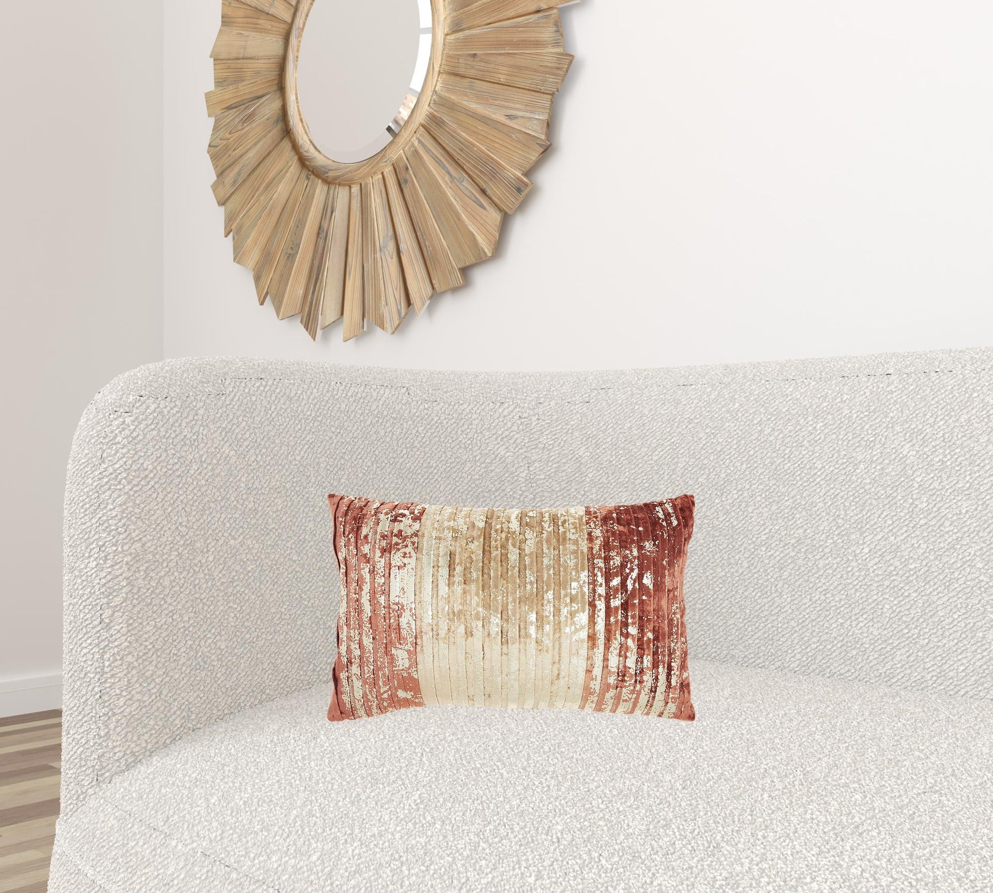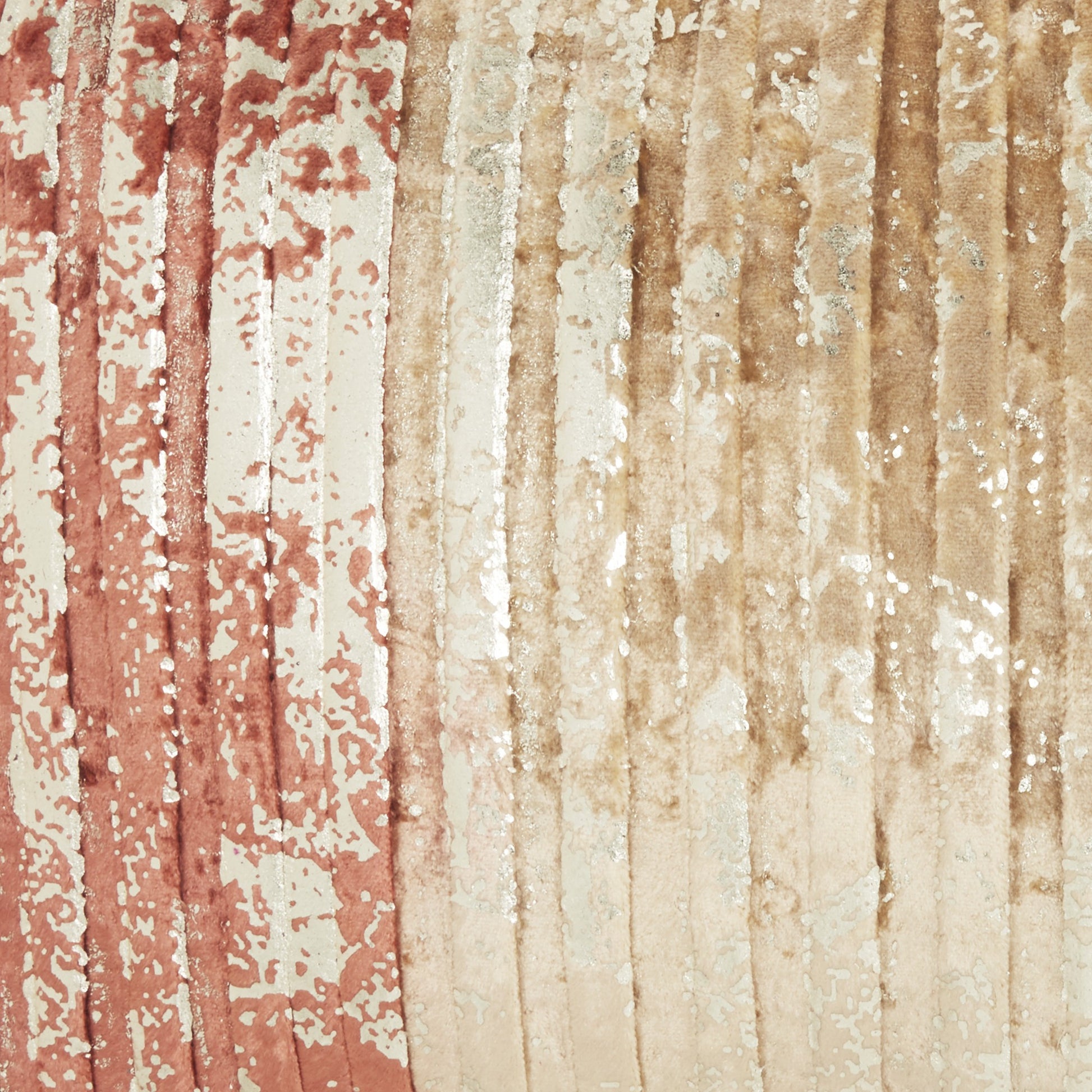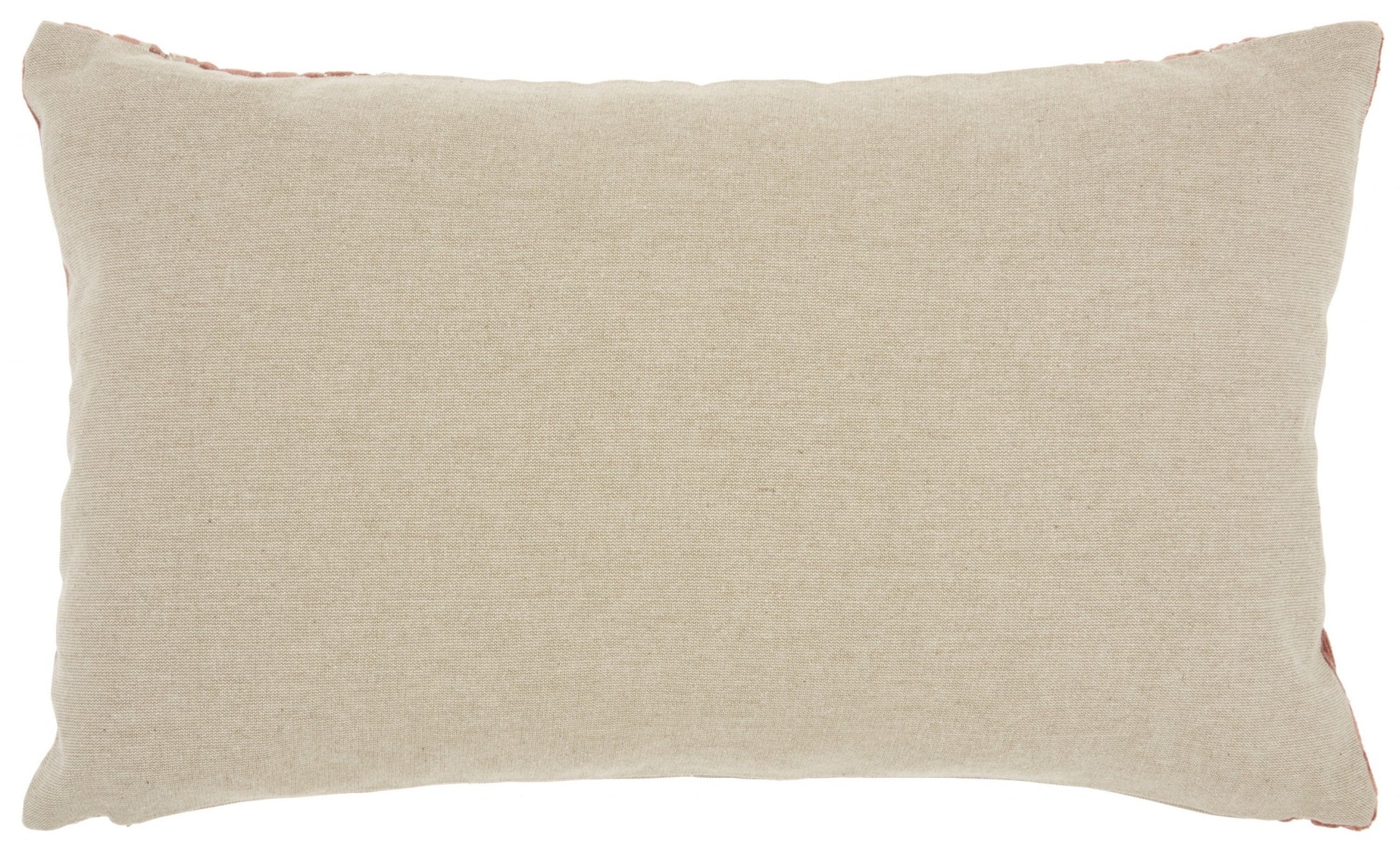 With this Two Tone Striped Lumbar Pillow you can elevate the look of any seating area in your home. This rectangular shaped pillow is covered in a soft velour fabric in a two tone tea pink and beige colorway. This fabric has a striped design on it with alternating embossed and plain stripes. The middle section is in a beige color while the sides have the tea pink color on them. All throughout the front of the cushion is a pattern that resembles the look of bleach spots and adds just the right amount of depth to the overall look. You can use this pillow to add a pop of design to your bed, your couch, or even your favorite chair. 5" H x 12" W x 20" D