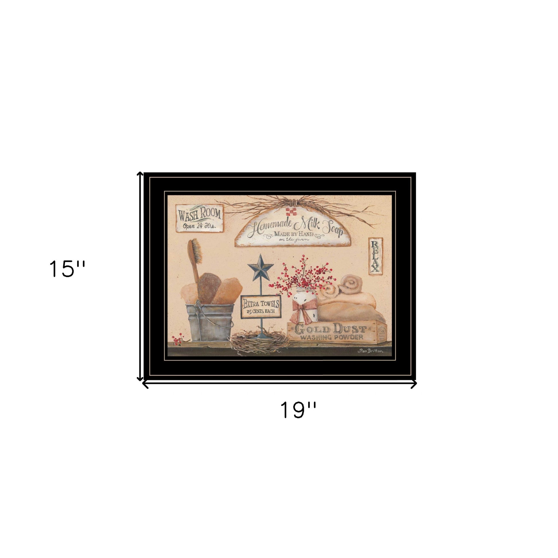 This wash room 3 black framed print wall art will add a beautiful decorative accent to your decor. This print is a visual artistic expression that allows you to decorate your space in style. Reproduced for you on paper, this hanging decorative accent will be a trendy and fashionable way to dress your walls. Adding this hanging wall art to your space to make your room feel more finished and attractive. Instantly liven up your space with this art that brings color and dimension to your walls. 15 inches H x 19 inches W x 1 inches D