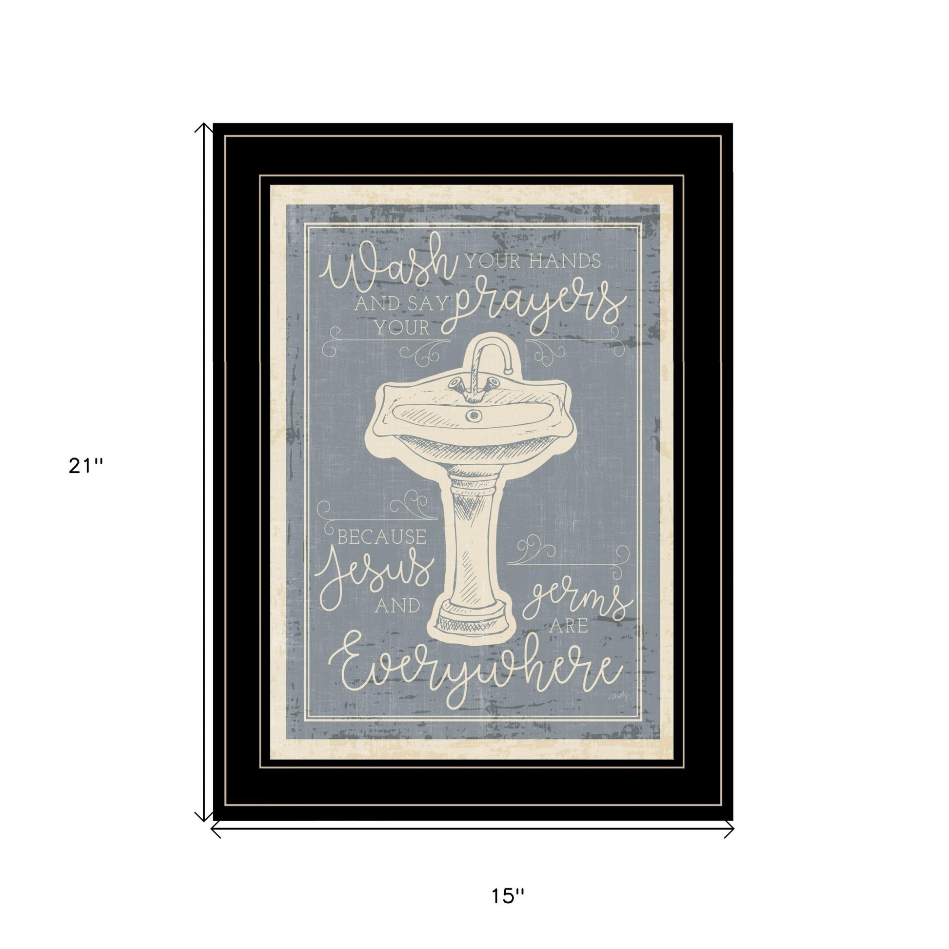 Unique and decorative, this wash your hands 8 black framed print wall art will leave a lasting impression. This print is a visual artistic expression that allows you to decorate your space in style. Reproduced for you on paper, this hanging decorative accent will be a trendy and fashionable way to dress your walls. Hang on your wall to add some up to date fashion and decoration. Utilize this opportunity to create a focal point in the room with this fabulous wall decor option. 21 inches H x 15 inches W x 1 inches D