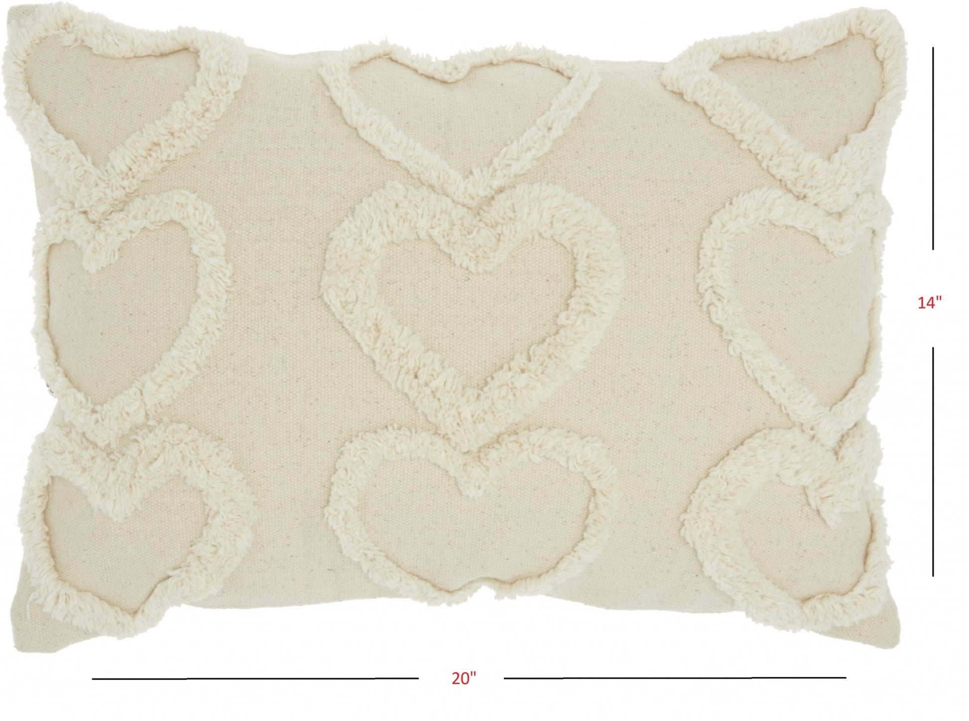 Add a touch of whimsy to your home with this Whimsical Heart Detail Off-White Lumbar Pillow which combines textural design and comfort. The fabric covering this lumbar pillow has a soft feel to it and has a stunning off-white color. This serves as the perfect background for the heart shaped details that are arranged in a grid pattern of 3x3x3. The heart shapes are made of shaggy off-white fabric which creates a nice monotone look. Please this lumbar pillow anywhere in your home, be it on your bed, your couch, or on your favorite chair. This pillow will be perfect as a statement piece as well. 5" H x 14" W x 20" D