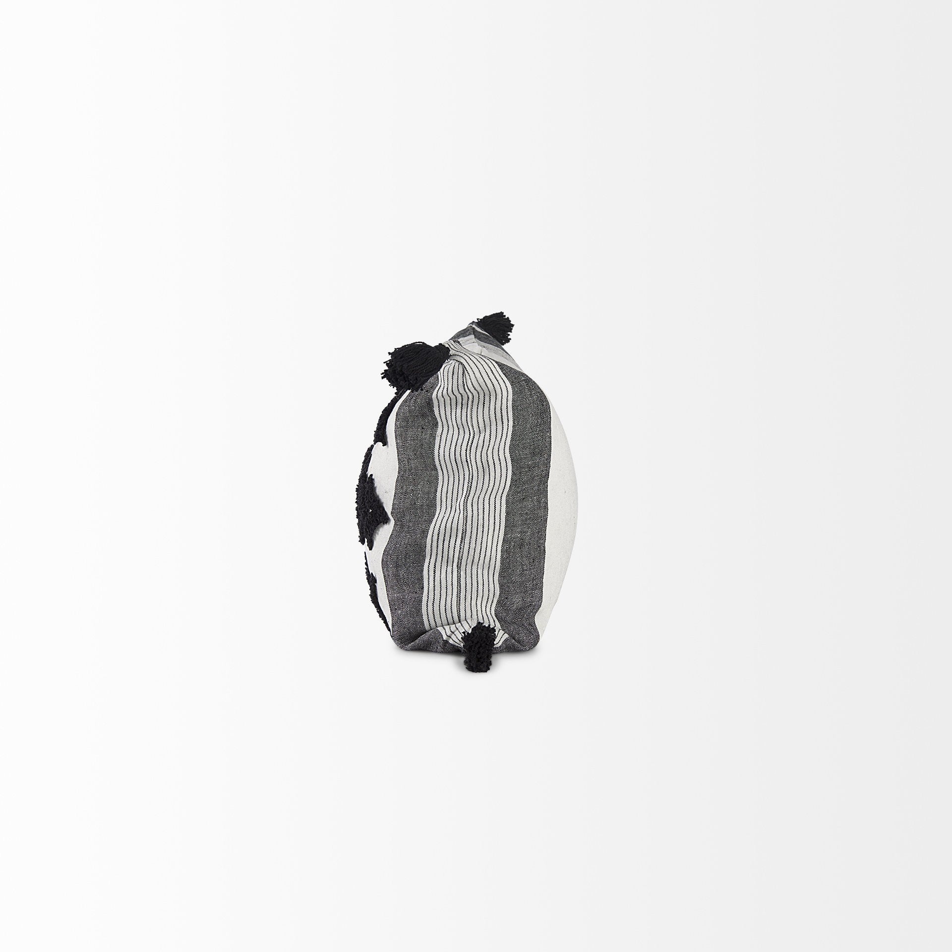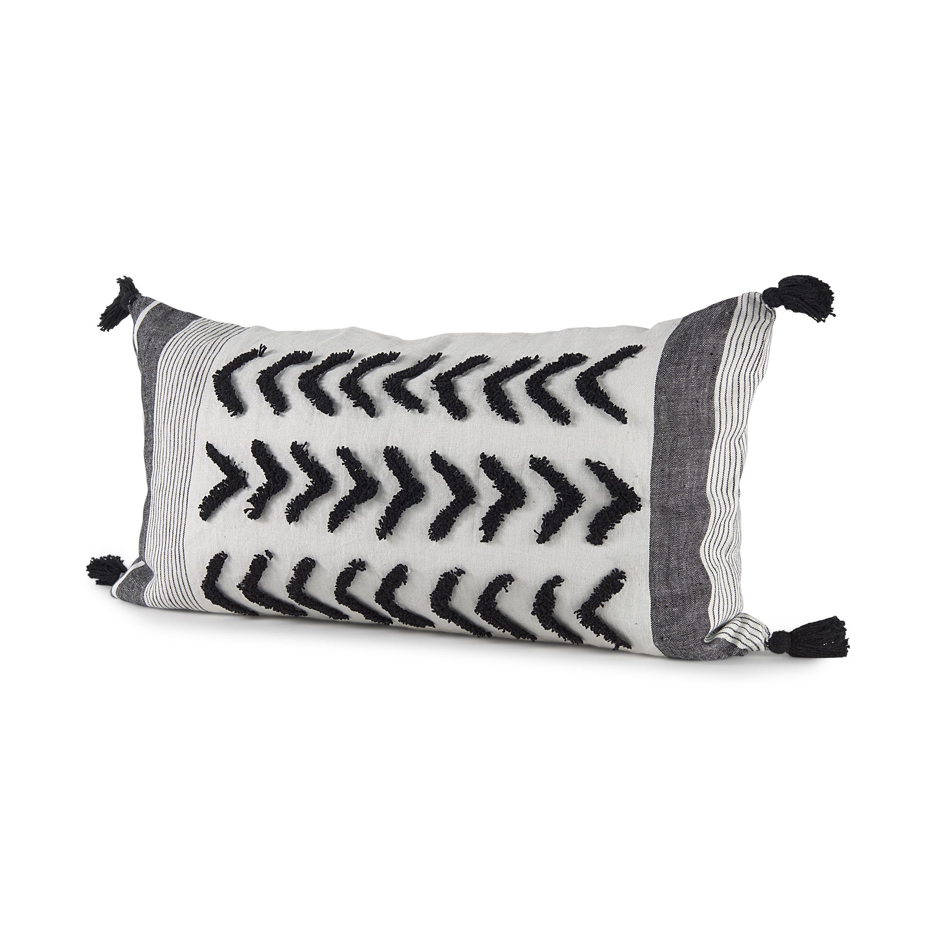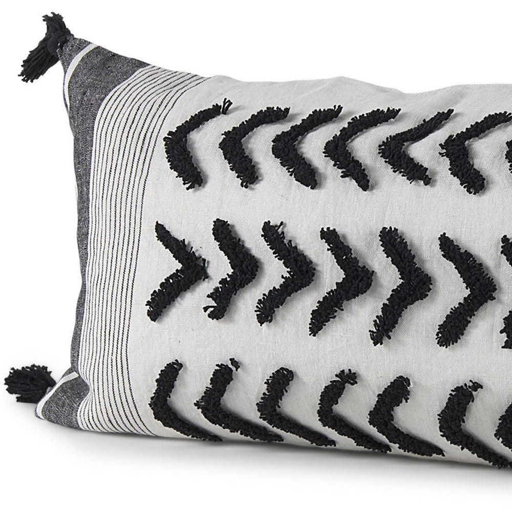 With this White and Gray Fringed Lumbar Pillow Cover you can add the perfect finishing touch to your couch. This Pillow cover is made highly durable and soft linen material that provides comfort beyond measure. The Pillow cover has a white background with gray and striped vertical lines on either edge. On top of the white background there is a black textured chevron pattern which matches the black tassles on all four corners. The back has a zip closure that ensures your Pillow stays in there securely. The neutral color palette will look great on top of any couch, bed or chair you have and go with any interior style you have in your home. This Pillow cover is also great for extra back support. 1" H x 26" W x 14" D