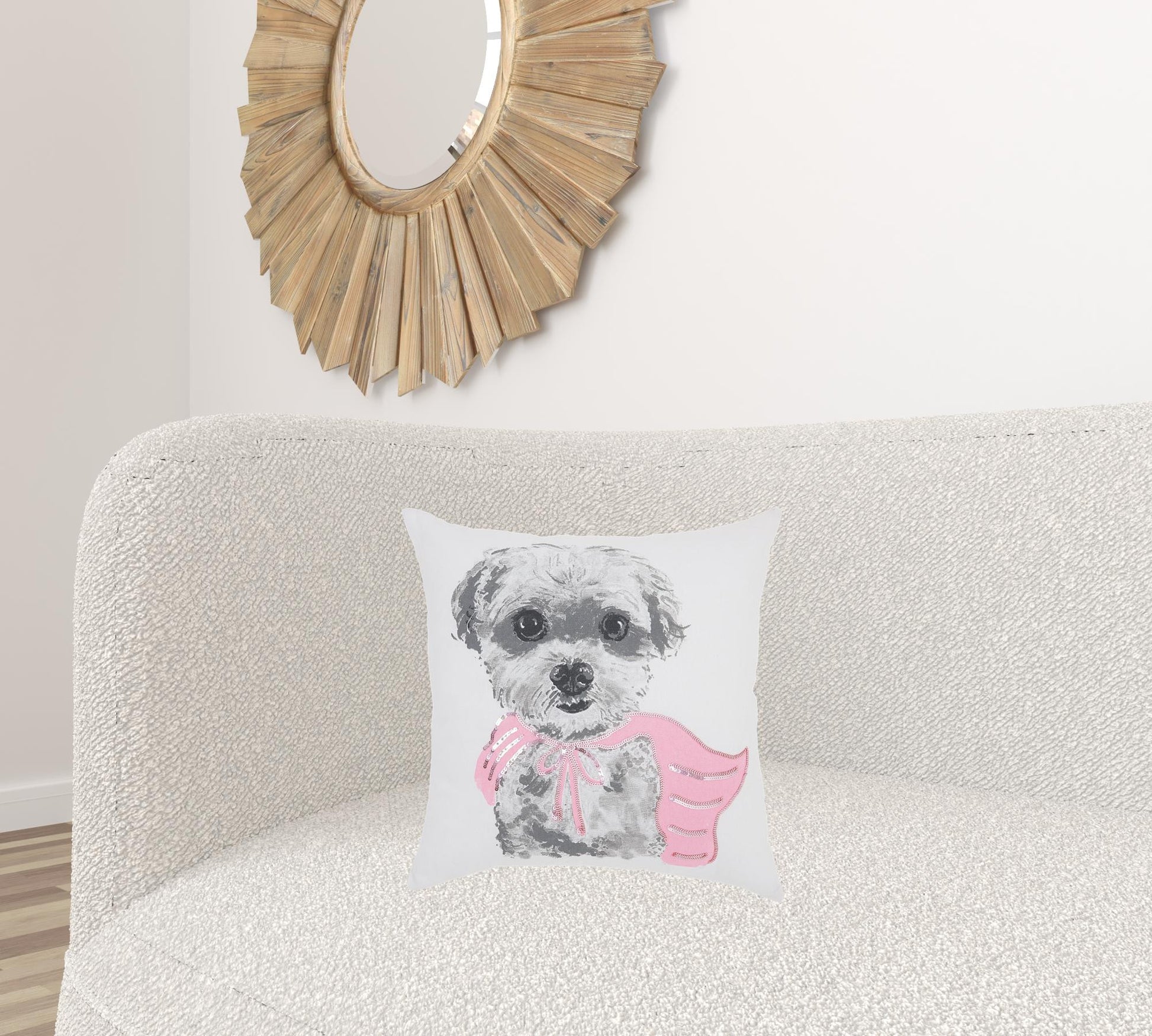 Add a trendy touch to your modern interior with this White and Pink Pup Super Throw Pillow that will encourage fun and playful tone into your home. Featuring a white base this adorable graphic print pillow features an adorable pup wearing a blush pink cape glimmering with sequin work to make this piece look more alluring. Skillfully crafted with a 100% premium cotton cover, this pillow printed on the front and solid on back is an outstanding way to add some creativity and whimsy to your space. Neutral tones with a pop of color, this accent pillow is the fun and stylish hint you have been looking for. 18” x 18” x 5”
