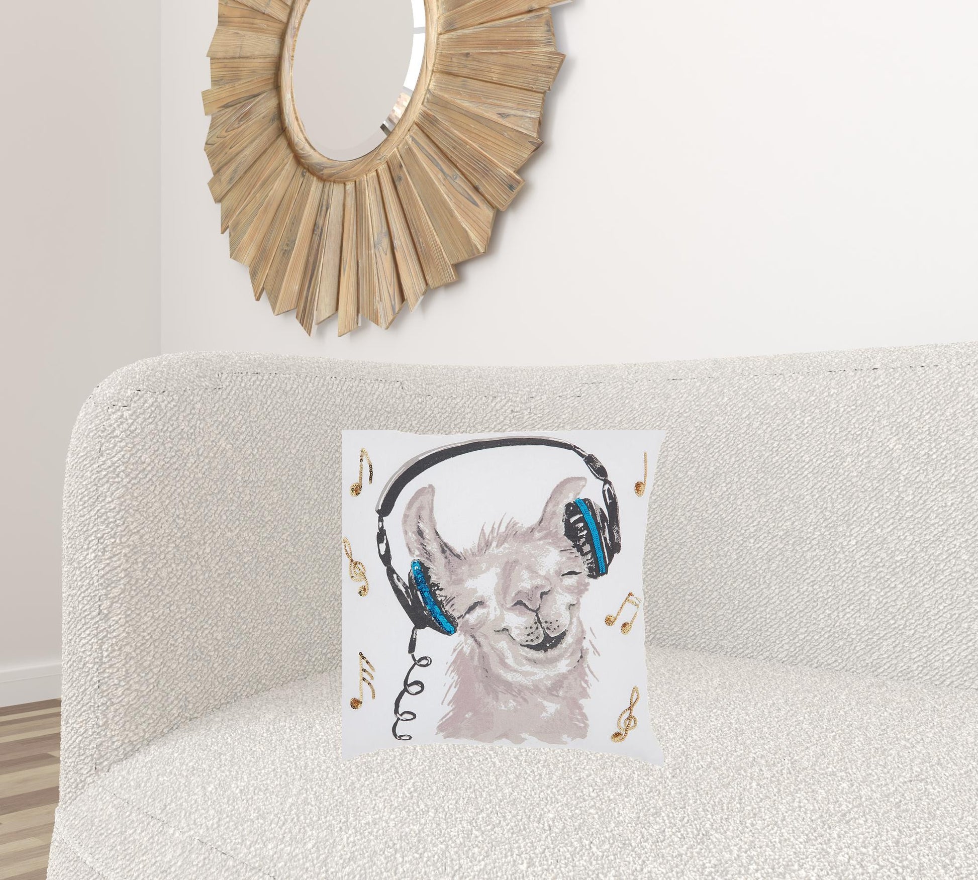 Let's put a big smile on your face with this adorable White and Teal Groovy Llama Throw Pillow in your living room or seating space. The adorable and playful baby llama graphic is bound to strike a chord in everyone’s heart in the coziest way while the pristine sequin work on the headphones add an eye-catching pop of color. The durability is unquestionable due to the use of high-quality 100% cotton on the outside and filled with fluffy polyester to give you the best complete experience. Add some decorative whimsy to your space with this adorable pillow. 18” x 18” x 5”