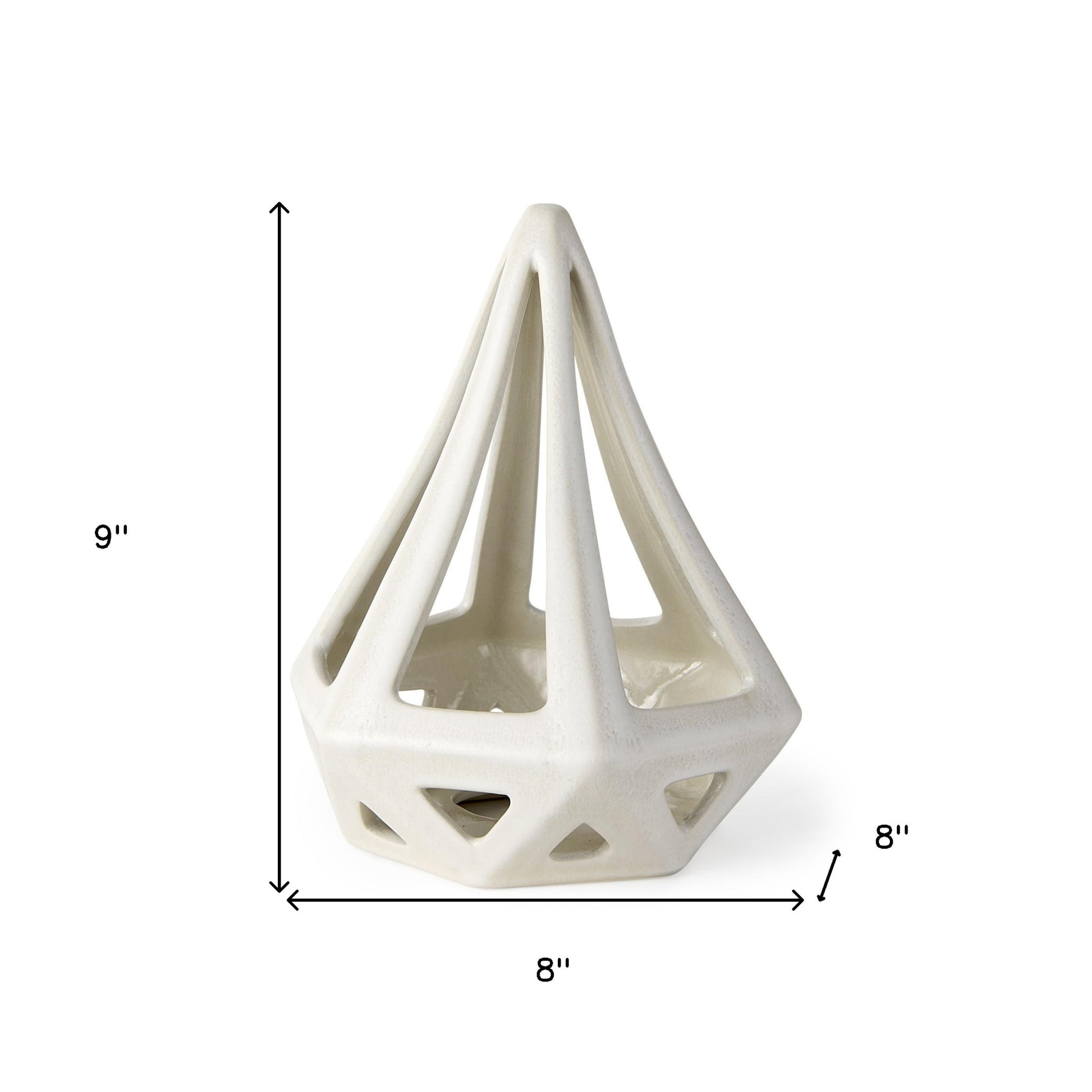 This White Crackle Glaze Ceramic Conical Sculpture will be the pefect addition to the decor in your home. This decor piece is made from ceramic and has a wide base with a conical shape at the top. This stunning geometric sculpture is full of clean lines and soft curves along with a gorgeous creamy white reactive glaze that gives off subtle hints of gold and tan depending on the light. The base has a diamond shape and has triangle cutouts in it while the top cone shape has larger triangles cut along the shape in it. The deisgn is see-through which not only look great but makes this decor piece light enought to be moved around. The neutral coloway and the minimal design allow you to use this decor piece with interior style or colors you already have in your home. 9" H x 8" W x 8" D