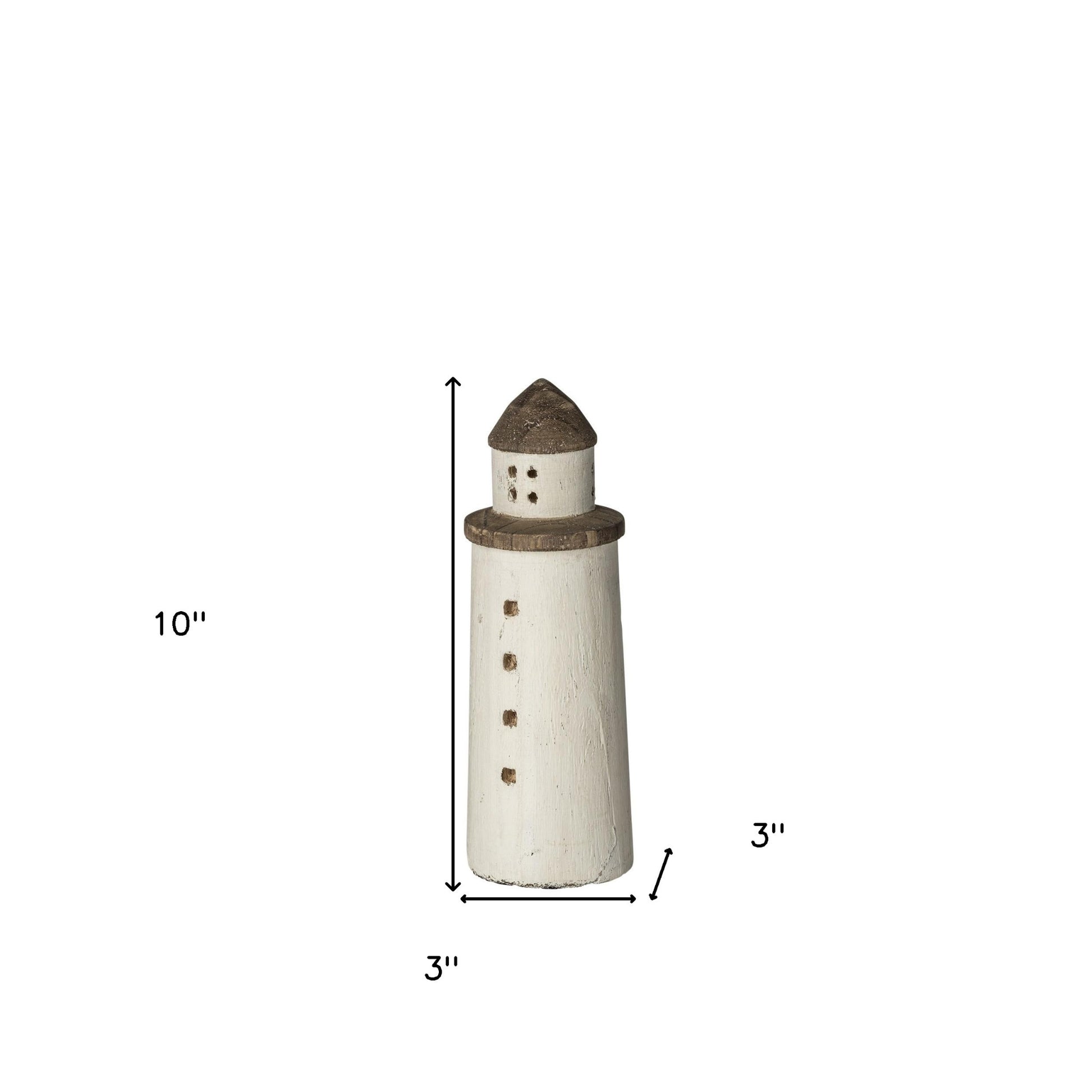 With this White Petite Rustic Wooden Lighthouse Decor Piece you can bring in the perfect beachy element to your home decor. This distressed wooden decor piece is shaped like a smaller lighthouse. The lower part of this piece is longer and has four small vertical windows in it. The upper part is smaller and have four windows in a square pattern. The tops of both of these parts is colored in a brown color and adds a rustic touch to the whole piece. You can use this decor piece in any room in your home as the neutral colors will work with any interior decor style you have. 10" H x 3" W x 3" D