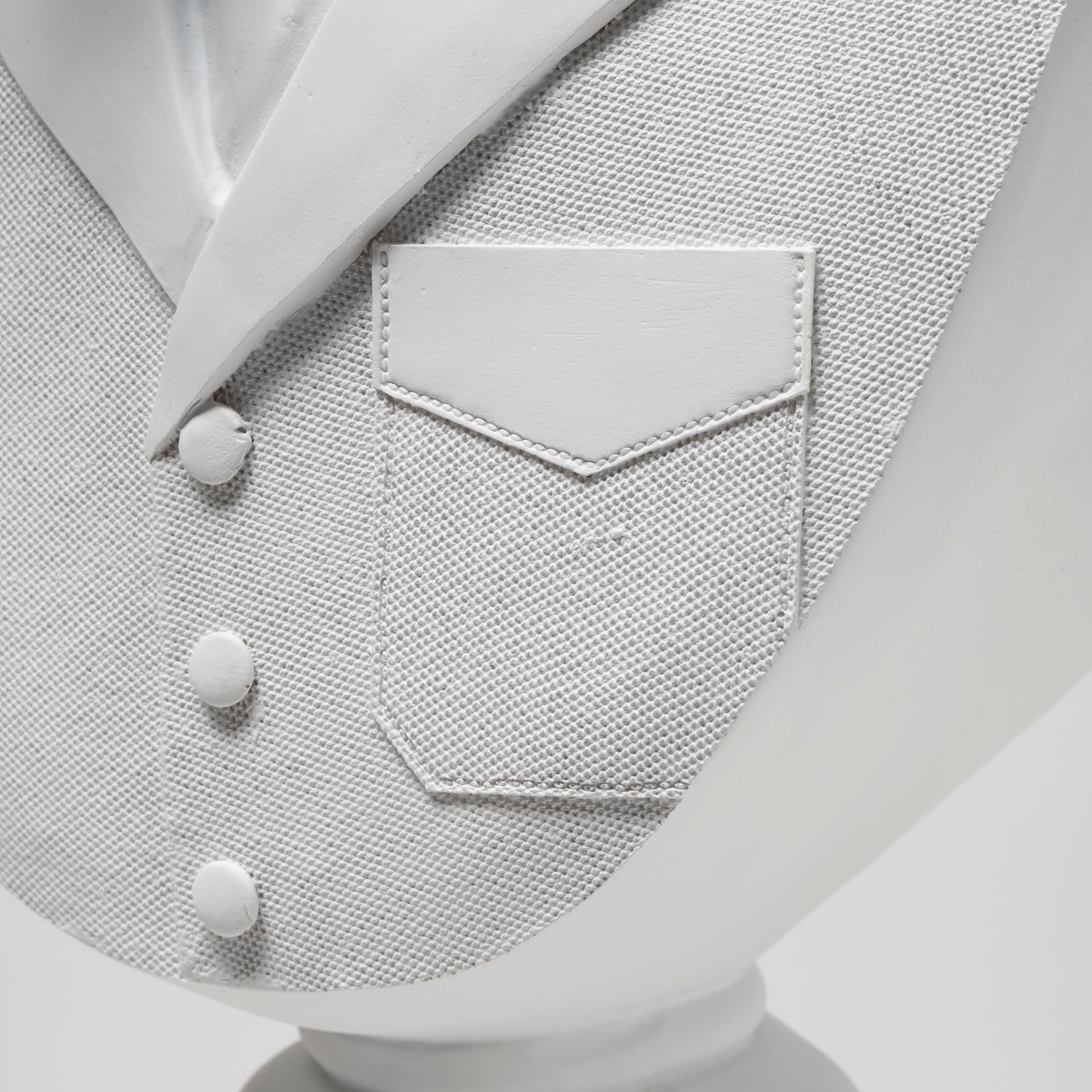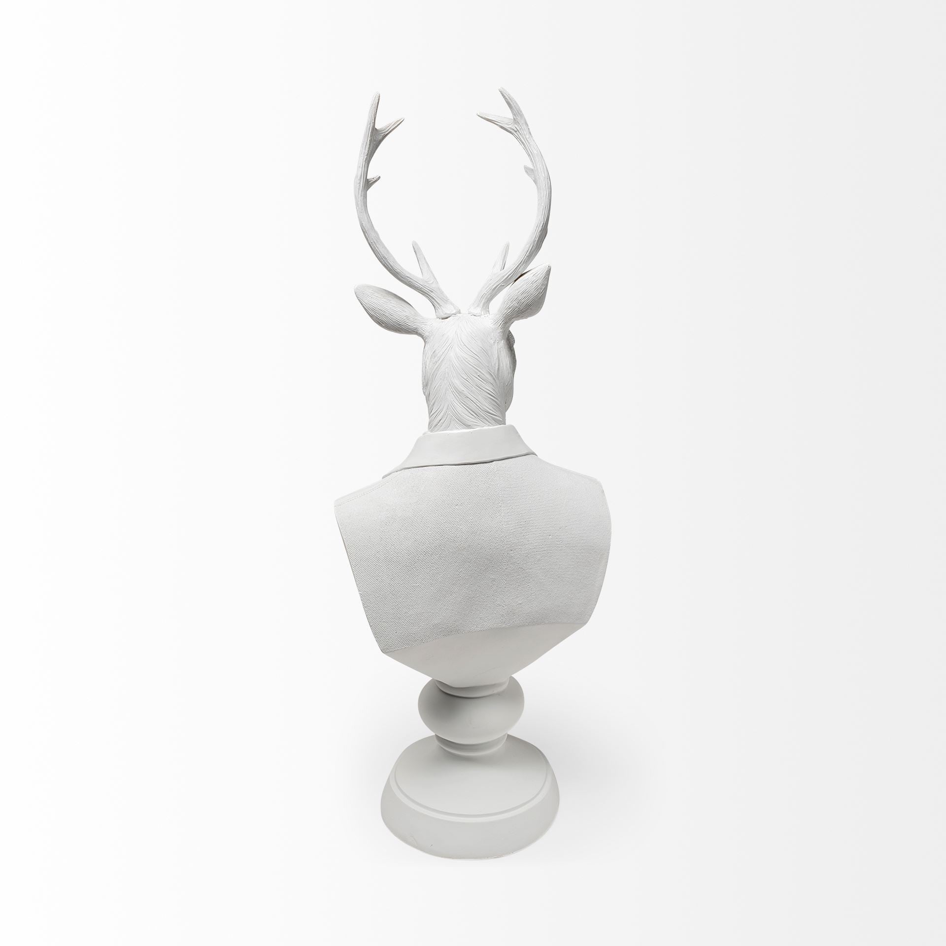 Add the perfect touch of whimsical design to your home with this White Resin Suited Deer Bust Decor Piece. This sculpture is made from resin and has a matte white finish on it. The base of this piece has a graduated goblet handle shape which flows in to the deer bust. The suited body is very detailed and shows off the lapel and the pocket square perfectly. The deer head also has details in it that bring the whole piece together and add depth and dimension to the look of this whole piece. While this piece leans more whimsical, the neutral color makes it suitable for formal decor as well. 23" H x 6" W x 8" D