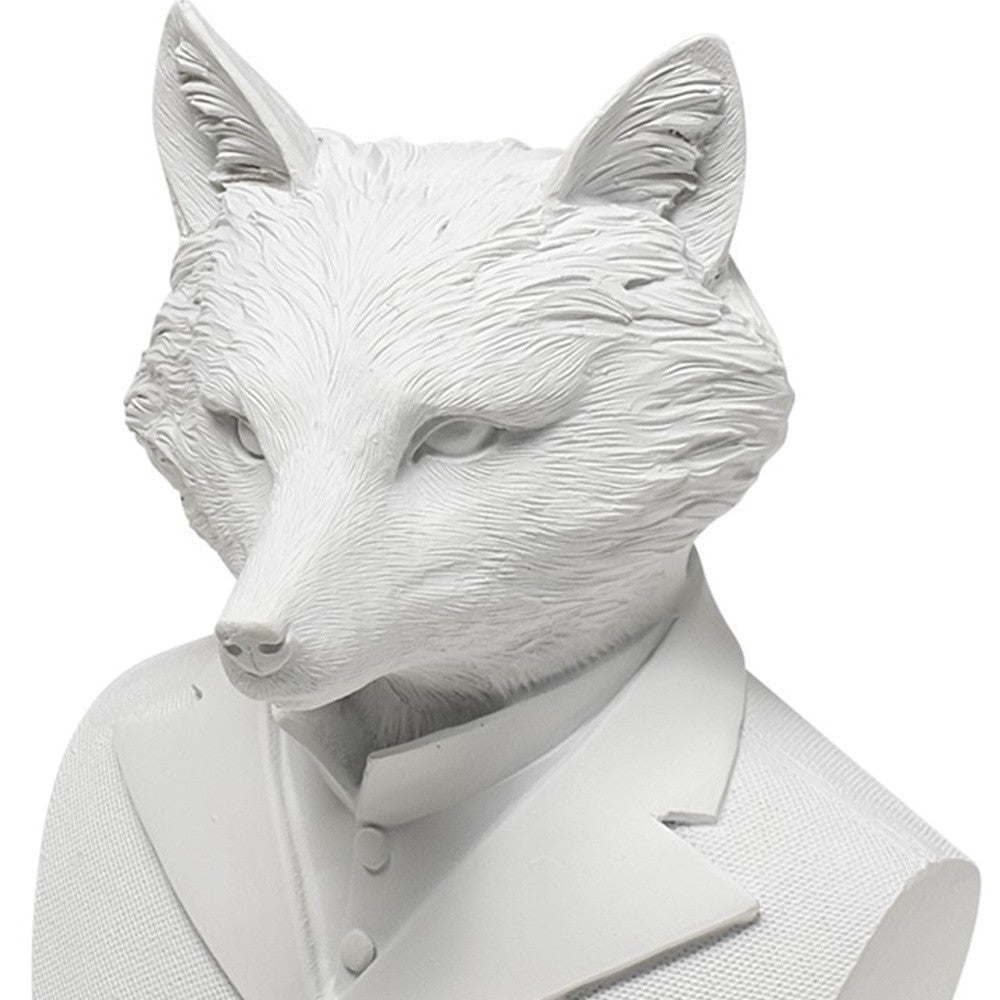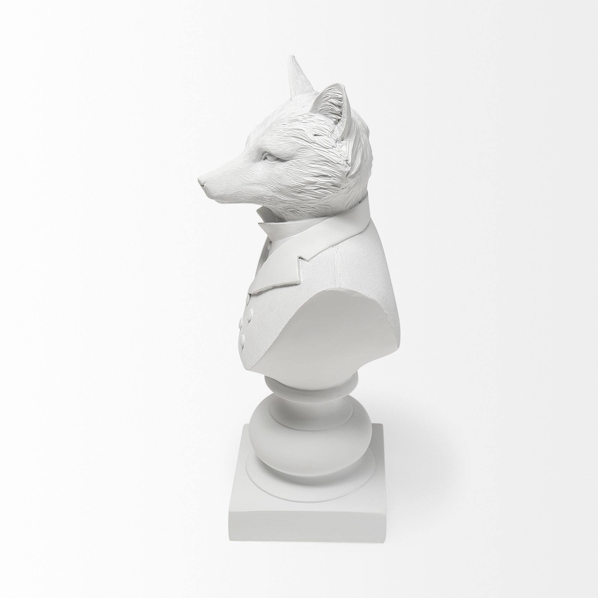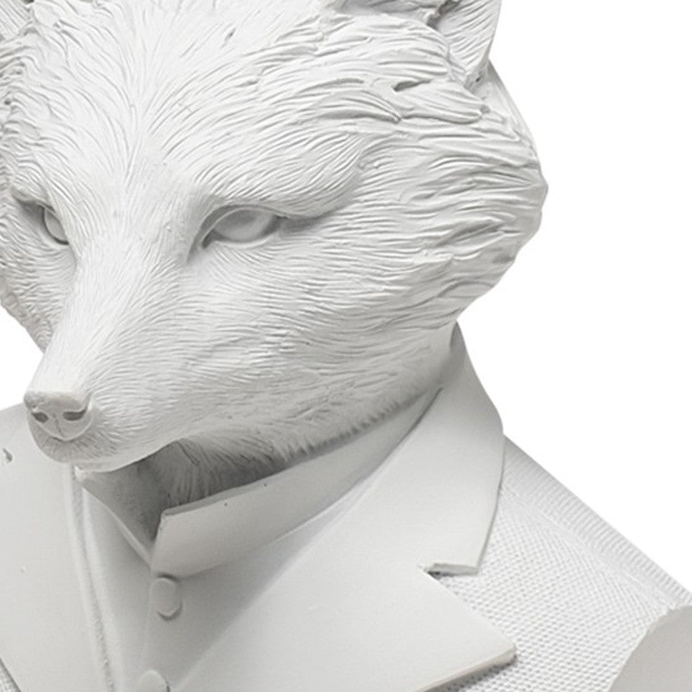 Add the perfect touch of whimsical design to your home with this White Resin Suited Fox Bust Decor Piece. This sculpture is made from resin and has a matte white finish on it. The base of this piece has a graduated goblet handle shape sitting on top of a square base which flows in to the fox bust. The suited body is very detailed and shows off the lapel and the buttons perfectly. The fox head also has details in it that bring the whole piece together and add depth and dimension to the look of this whole piece. While this piece leans more whimsical, the neutral color makes it suitable for formal decor as well. 13" H x 5" W x 6" D