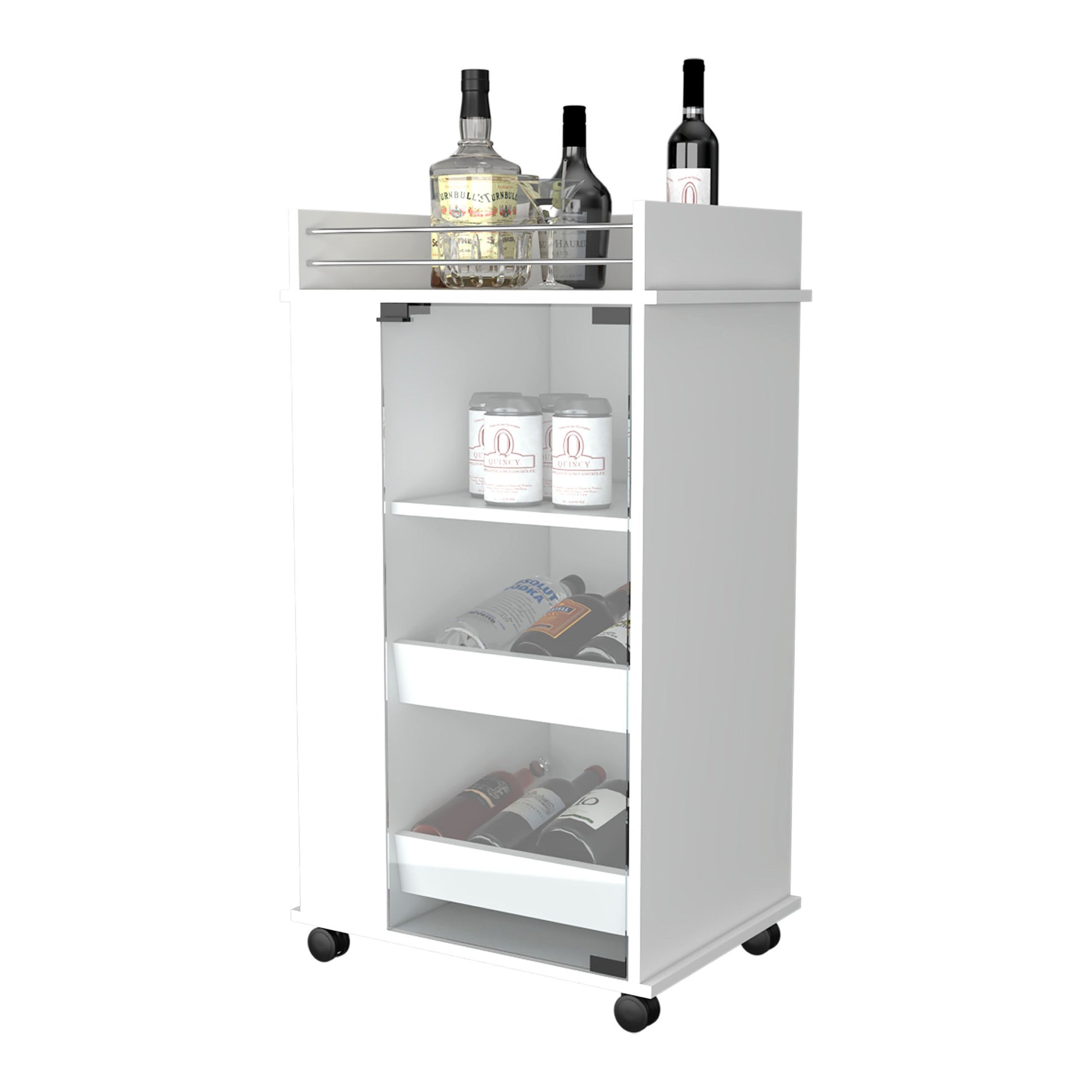 Add a touch of modern elegance to your home with this white rolling bar cart. Crafted from high-quality manufactured wood, this cart features a sleek rectangular shape that is both stylish and practical. The white color adds a clean and sophisticated look to any space. Equipped with convenient cabinets, this bar cart provides ample storage for your favorite wines and spirits. The included wheels make it easy to move the cart from room to room, allowing you to entertain guests wherever you please. Whether you're hosting a party or simply relaxing with a glass of wine, this bar cart is sure to impress. Take your entertaining game to the next level with this versatile and chic addition to your home decor. 39.02-inch H x 21.65-inch W x 16.34-inch D