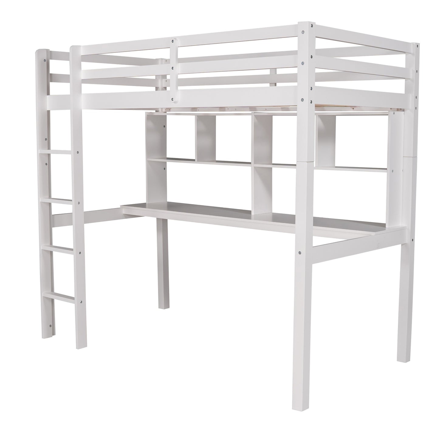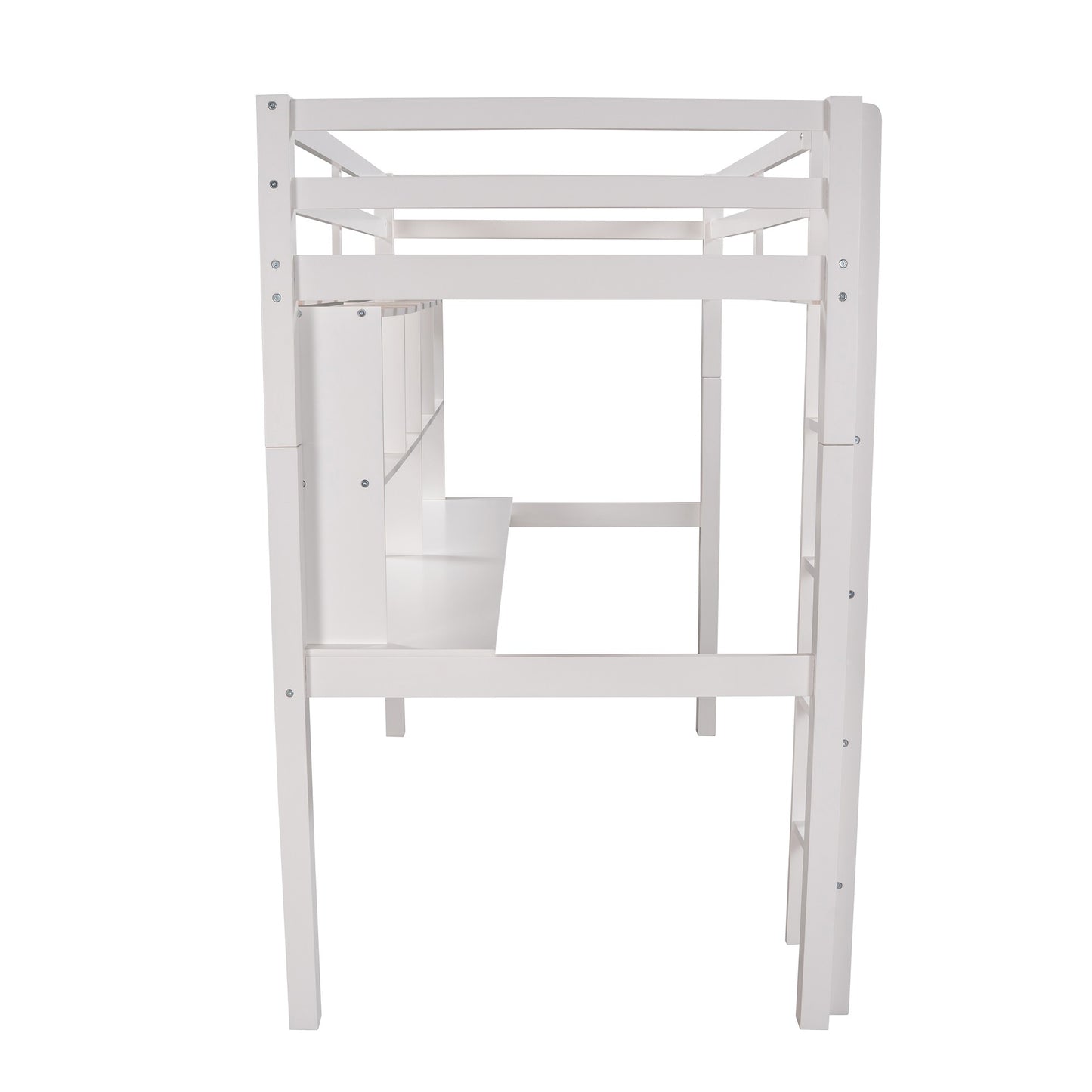 Utilize every inch of the available space with the super cool White Twin-Size Loft Bed WithDesk & Shelves. This awesome set features a loft Bed with a ladder and railing, a super workstation underneath, and shelves for plenty of storage. The entire frame of this loft Bed is made from pine wood and high-quality MDF, it is sturdy, durable, and super comfortable. The Bed features wood slats so there is no need to buy a box spring. It comes with a beautiful classic white finish that makes it a lovely sight in any Bedroom. 71" L x 42" W x 80" H